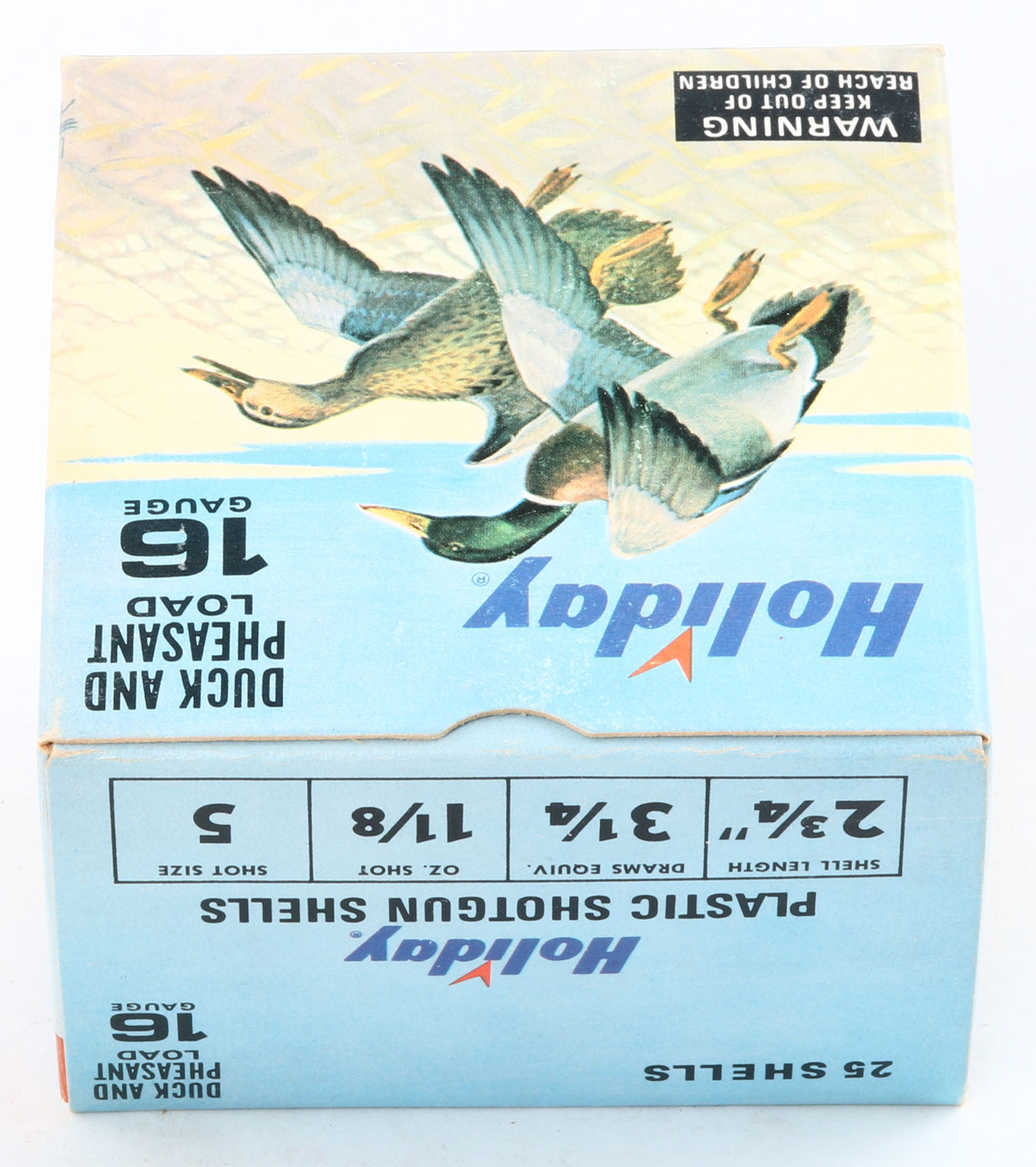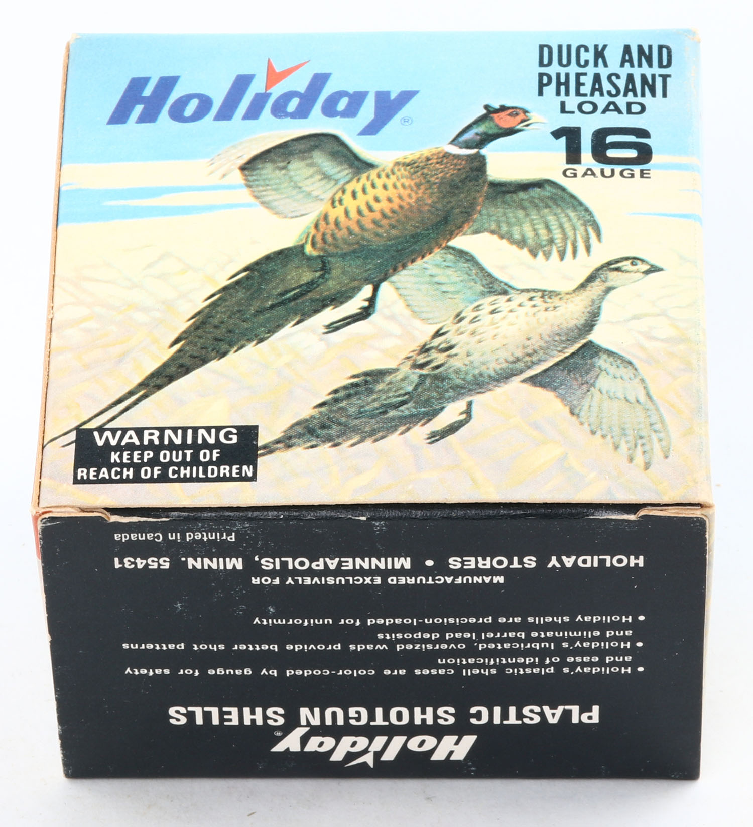 Holiday, Duck/Pheasant, 16ga, 2 3/4'', 1pc., Empty, shot size 5, multi color graphics by Les Kouba, box is very solid with excellent colors. Grade: Excellent ++ - Value: 40 to 200