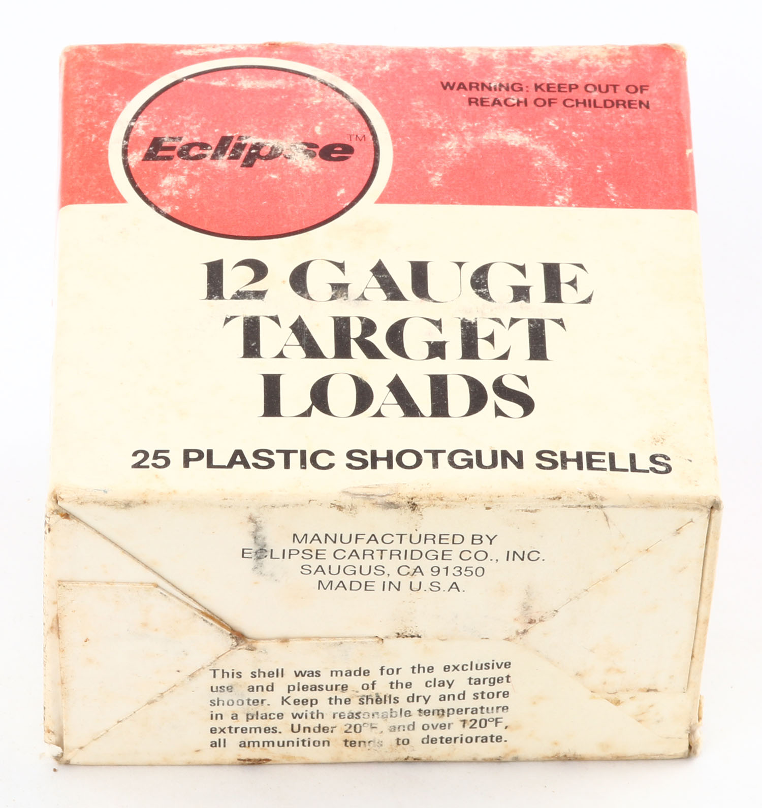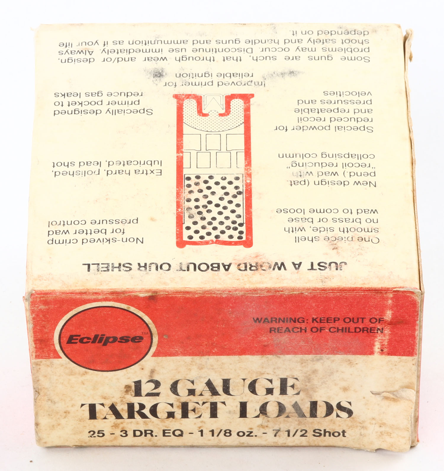 Eclipse, Target Loads, 12ga., 1pc., Full, shot size 7 1/2, multi-colored box, box has light age soiling, plastic shells are excellent. Grade: Very Good - Value: 10 to 20