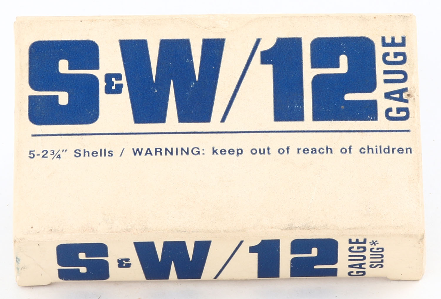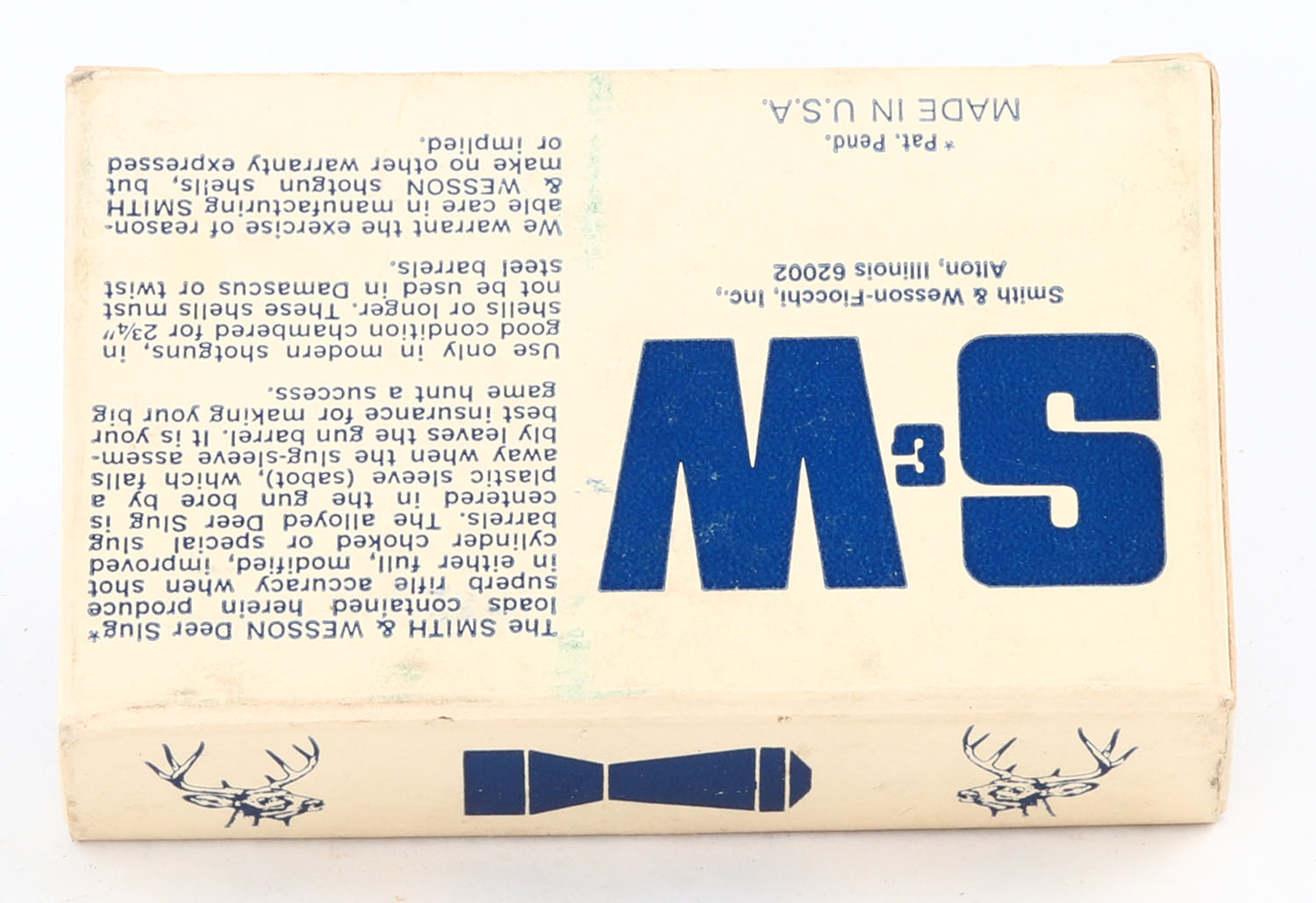 Smith & Wesson, 12ga., 2 3/4'', 1pc., Full, shot size Rifled Slug, blue & white box, box is solid, plastic shells are excellent. Grade: Excellent - Value: 10 to 20