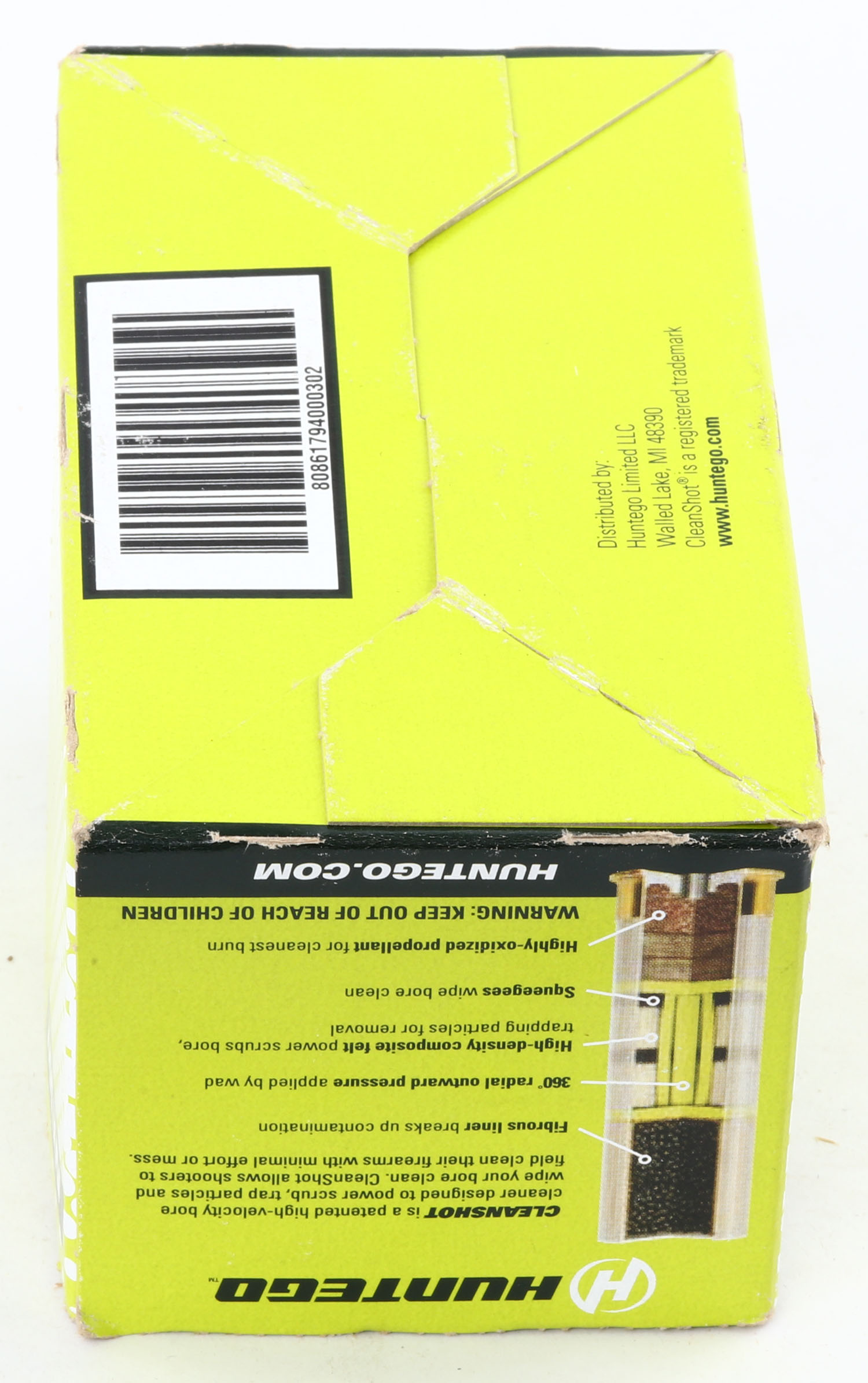 Huntego Cleanshot, 20ga., 1pc., Full Tray (24rds), Shot-Thru Gun Bore Cleaner, multi-colored boxes, boxes are very solid, plastic shells are excellent. Grade: Excellent + - Value: 10 to 30