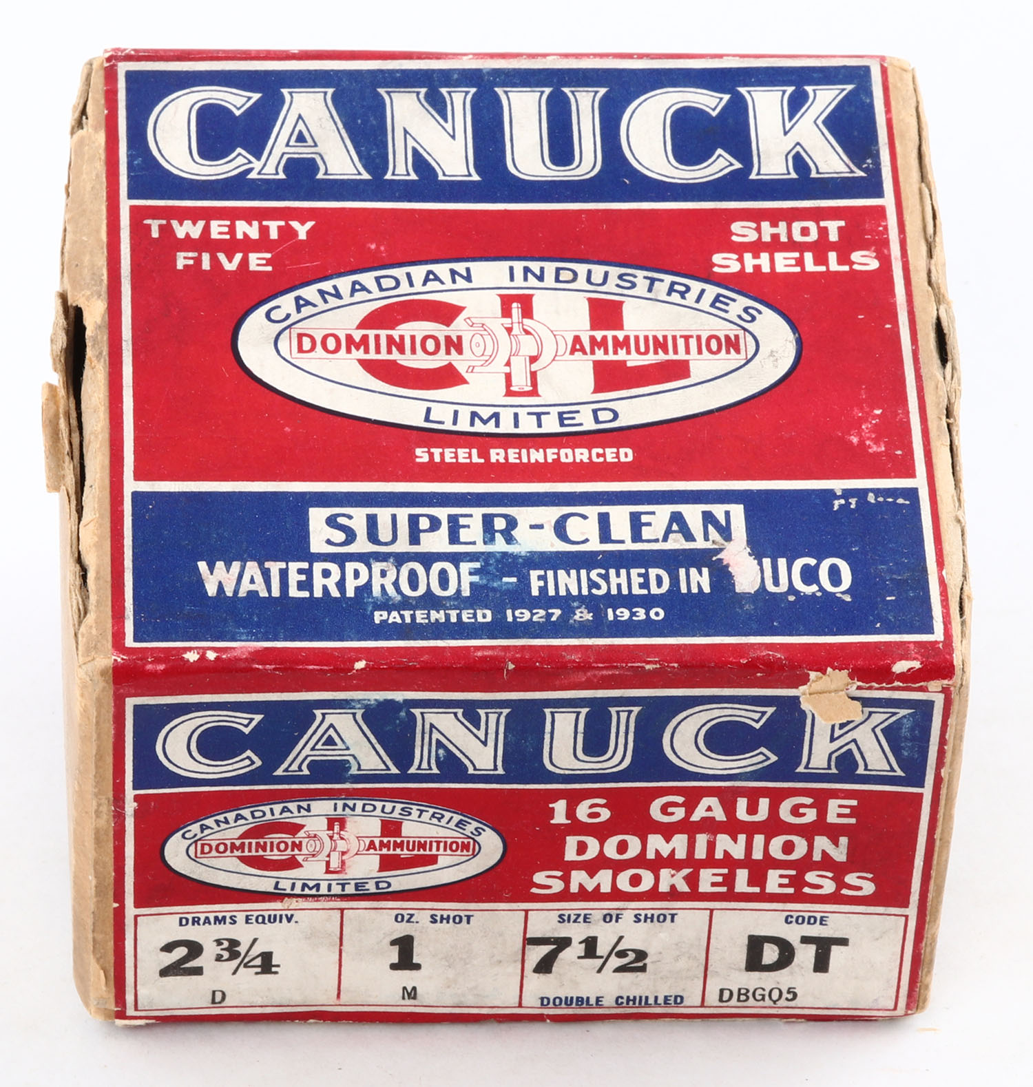 Dominion Cart. Co., Canuck, 16ga., 2pc., Empty has Insert, shot size 7 1/2CH, red, blue & white box, box has seam splits with edge wear, has excellent color to label, HARD TO FIND BOX! Grade: Very Good ++ - Value: 40 to 200