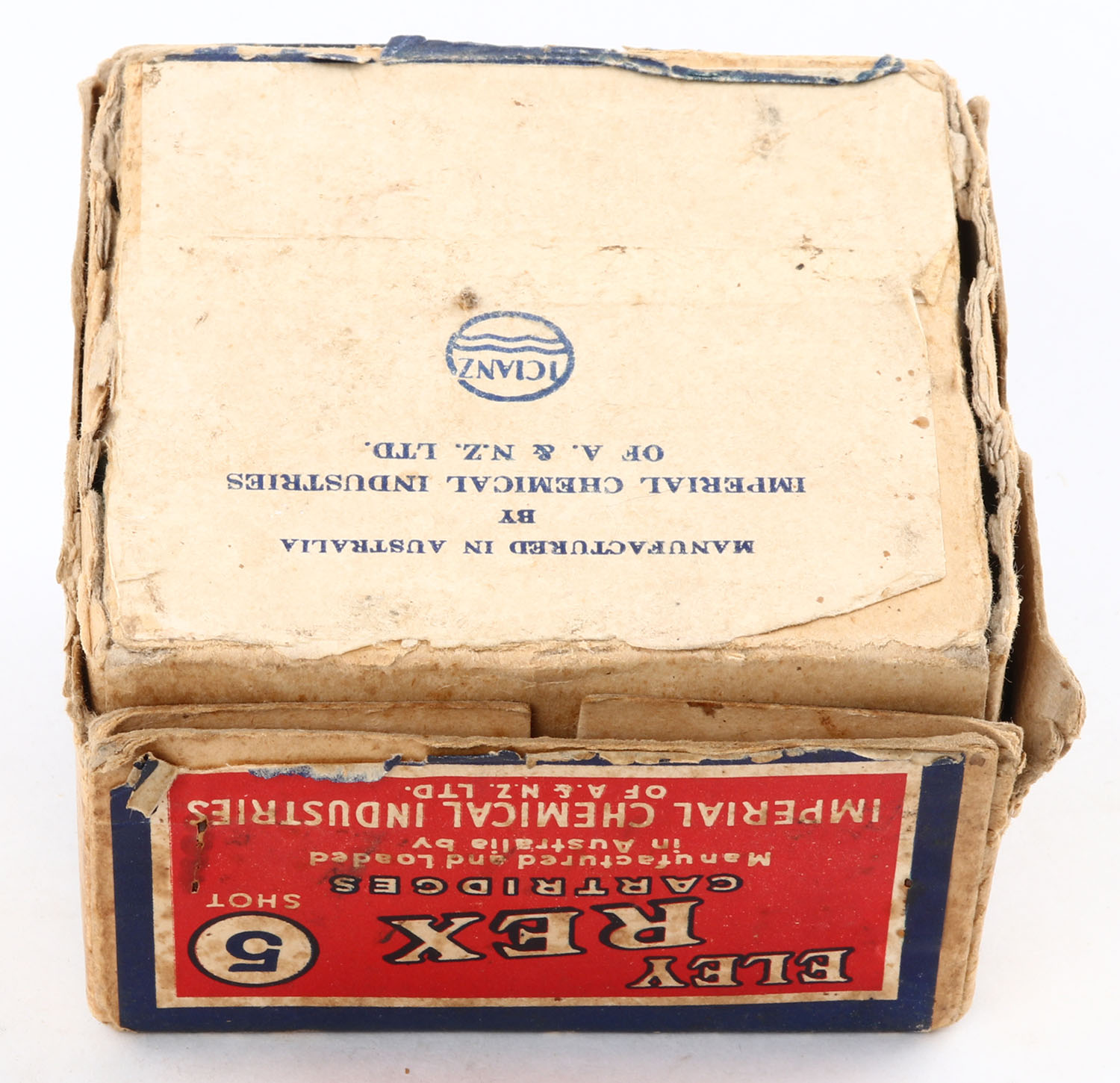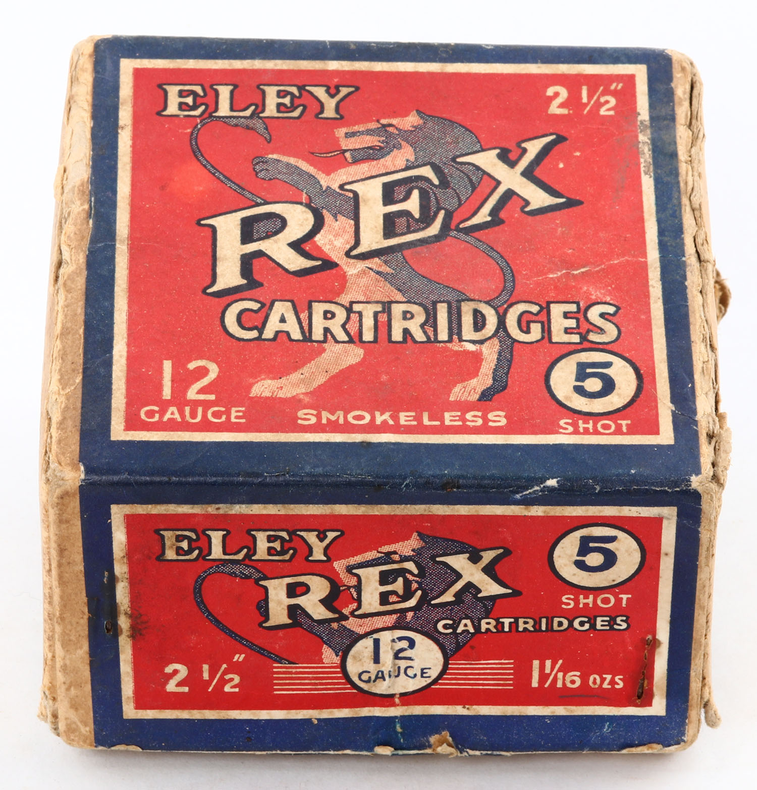 Eley, REX Cartridges, 12ga., 2pc., Empty, shot size 5, 2 1/2'', multi-colored box, box has light age soiling, edge wear, scuffing & partial seam splits. Grade: Good - Value: 40 to 200