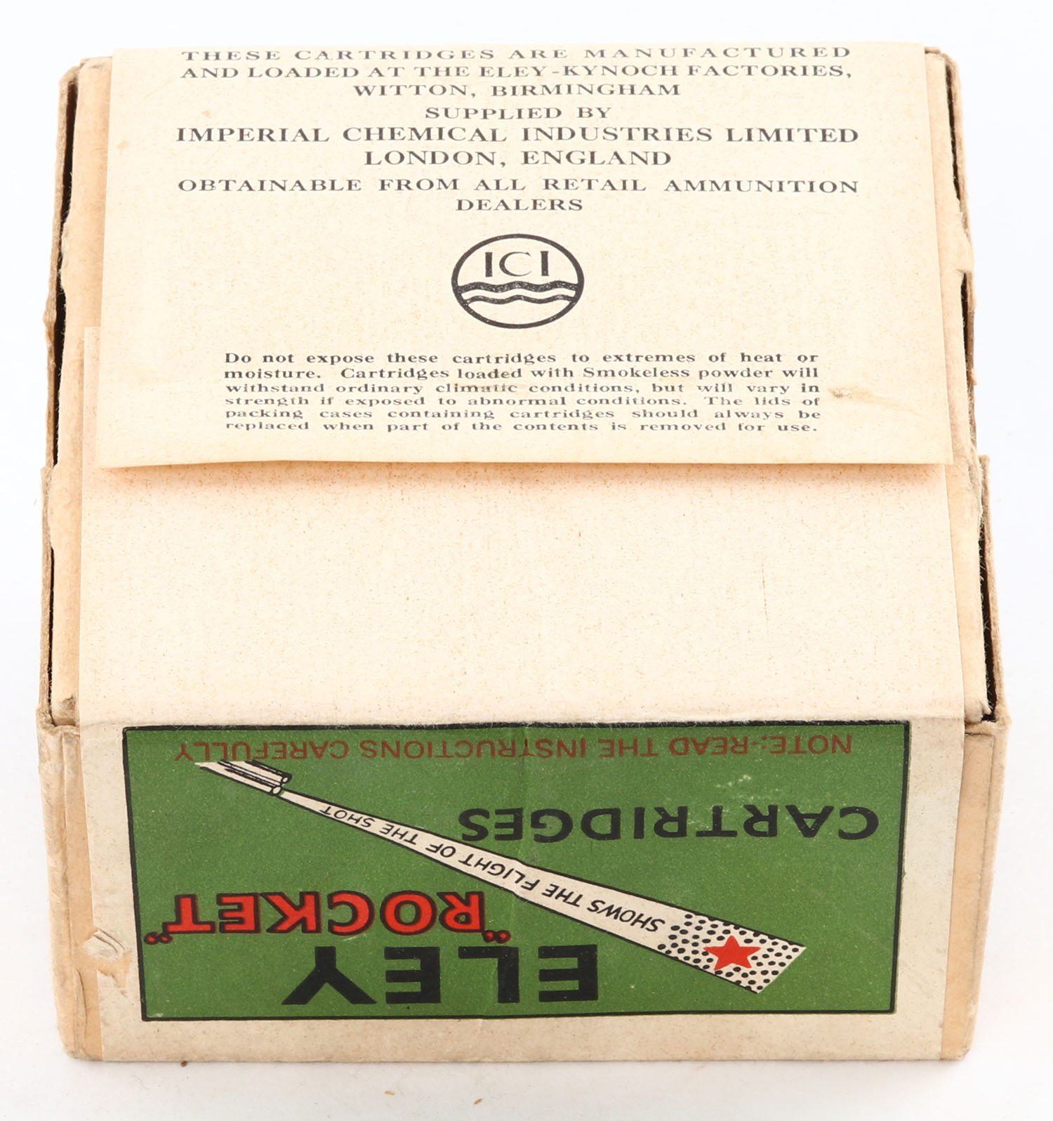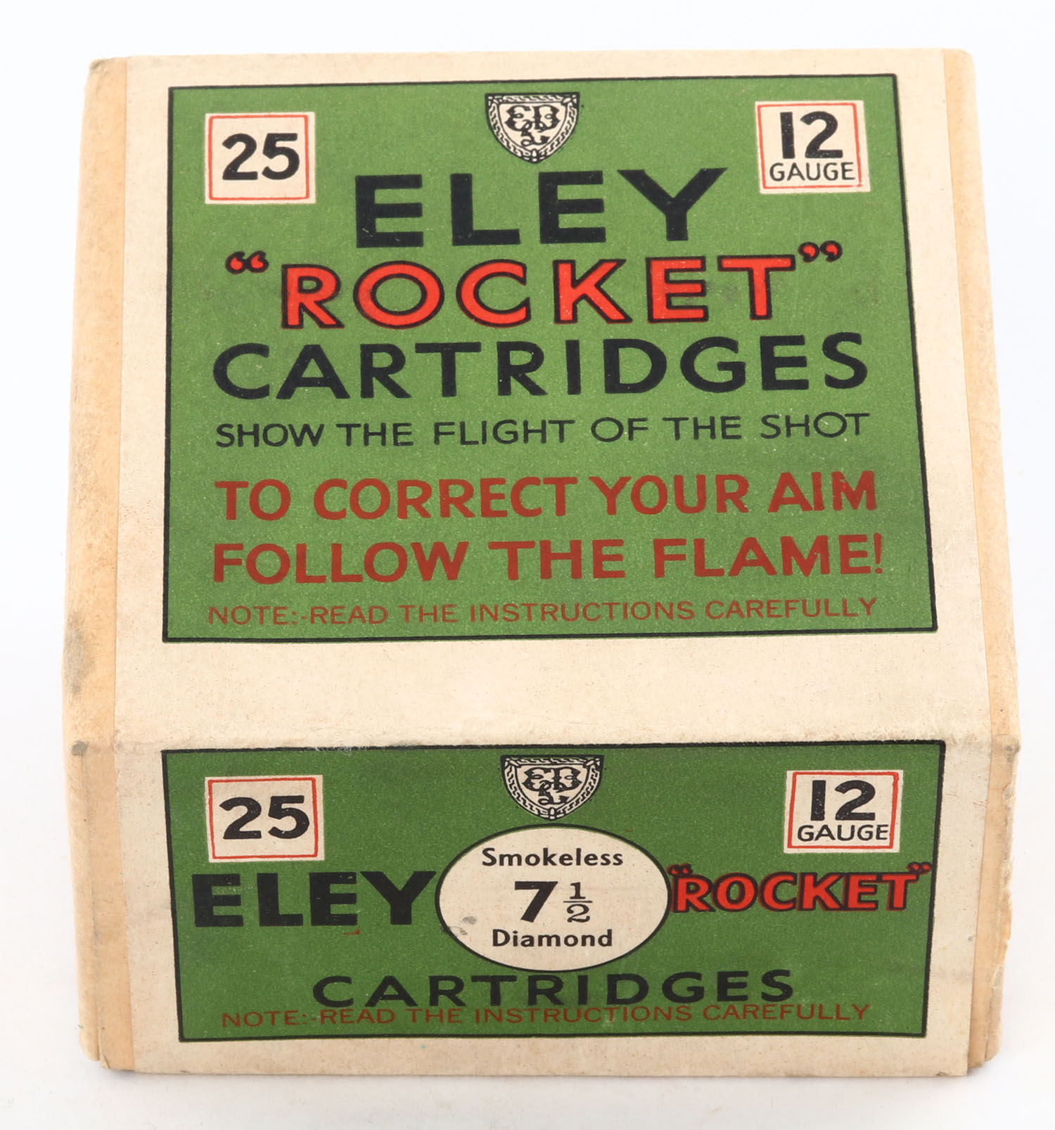 Eley, Rocket Cartridges, 12ga., 2pc., Empty, shot size 7 1/2CH, buff box with multi-colored label, box is very solid with excellent color. Grade: Excellent ++ - Value: 40 to 200