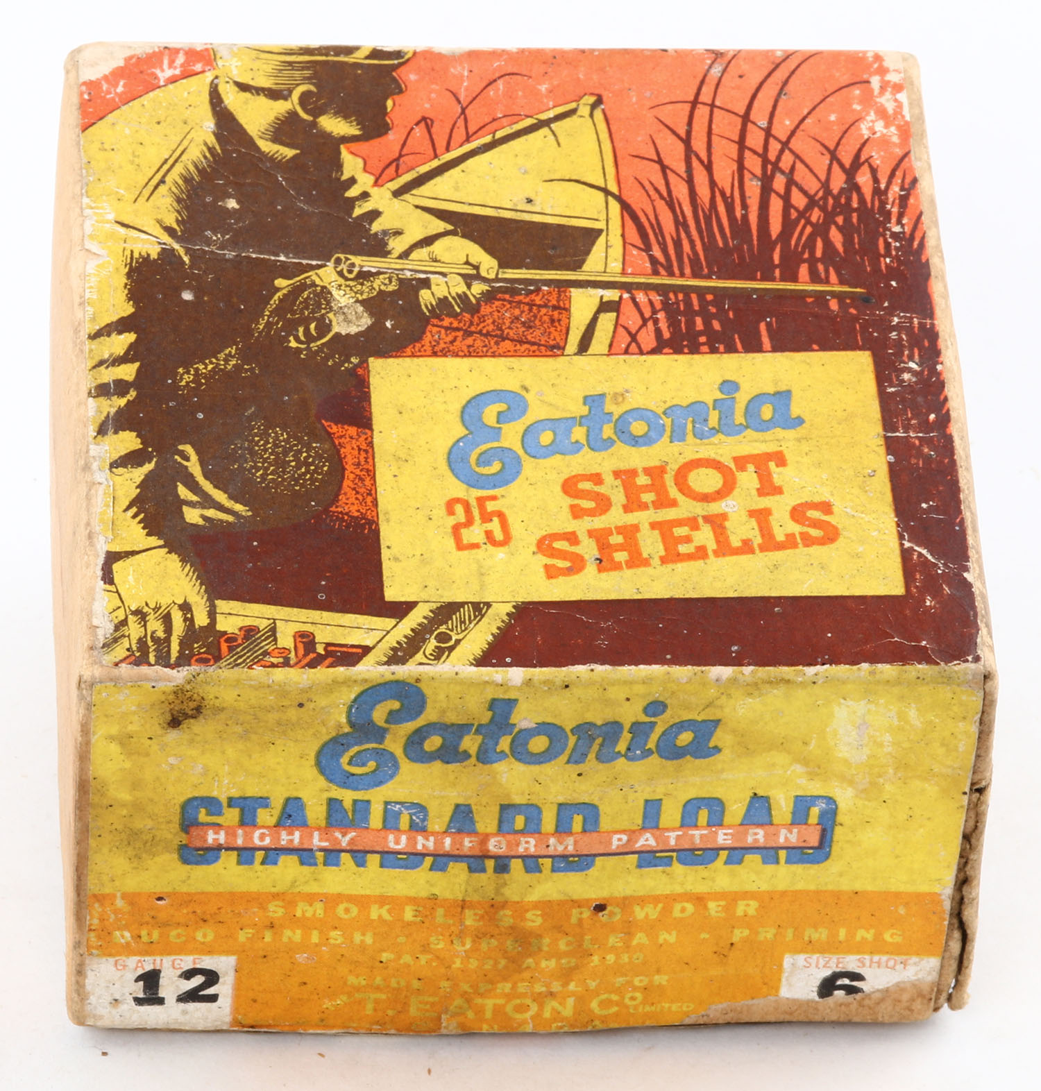 Eatonia, Standard Load, 12ga., 2pc., Empty, buff box with multi-colored label, box has age soiling with scuffing, box has a partial seam spit with great colors. Grade: Very Good - Value: 50 to 150