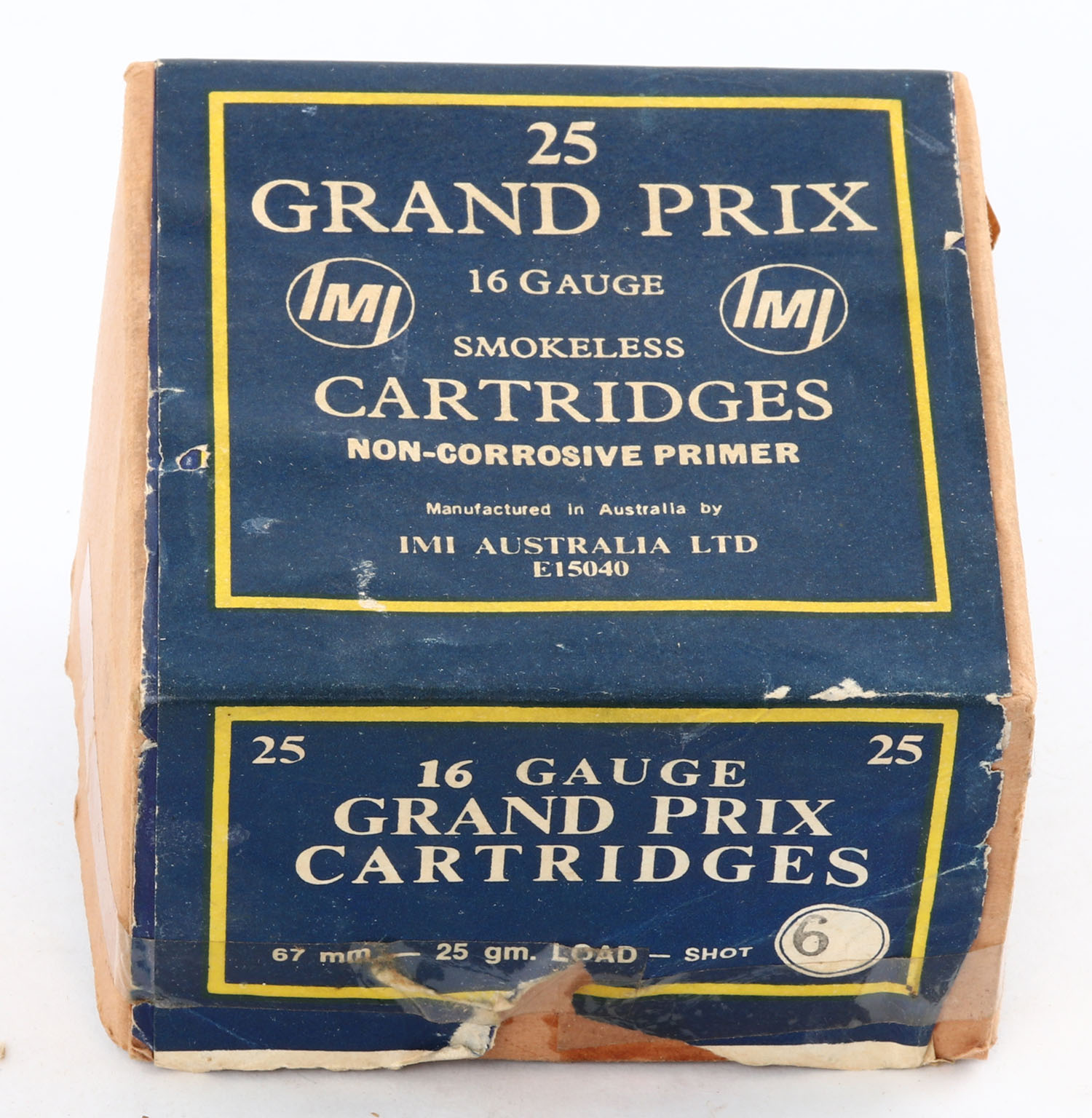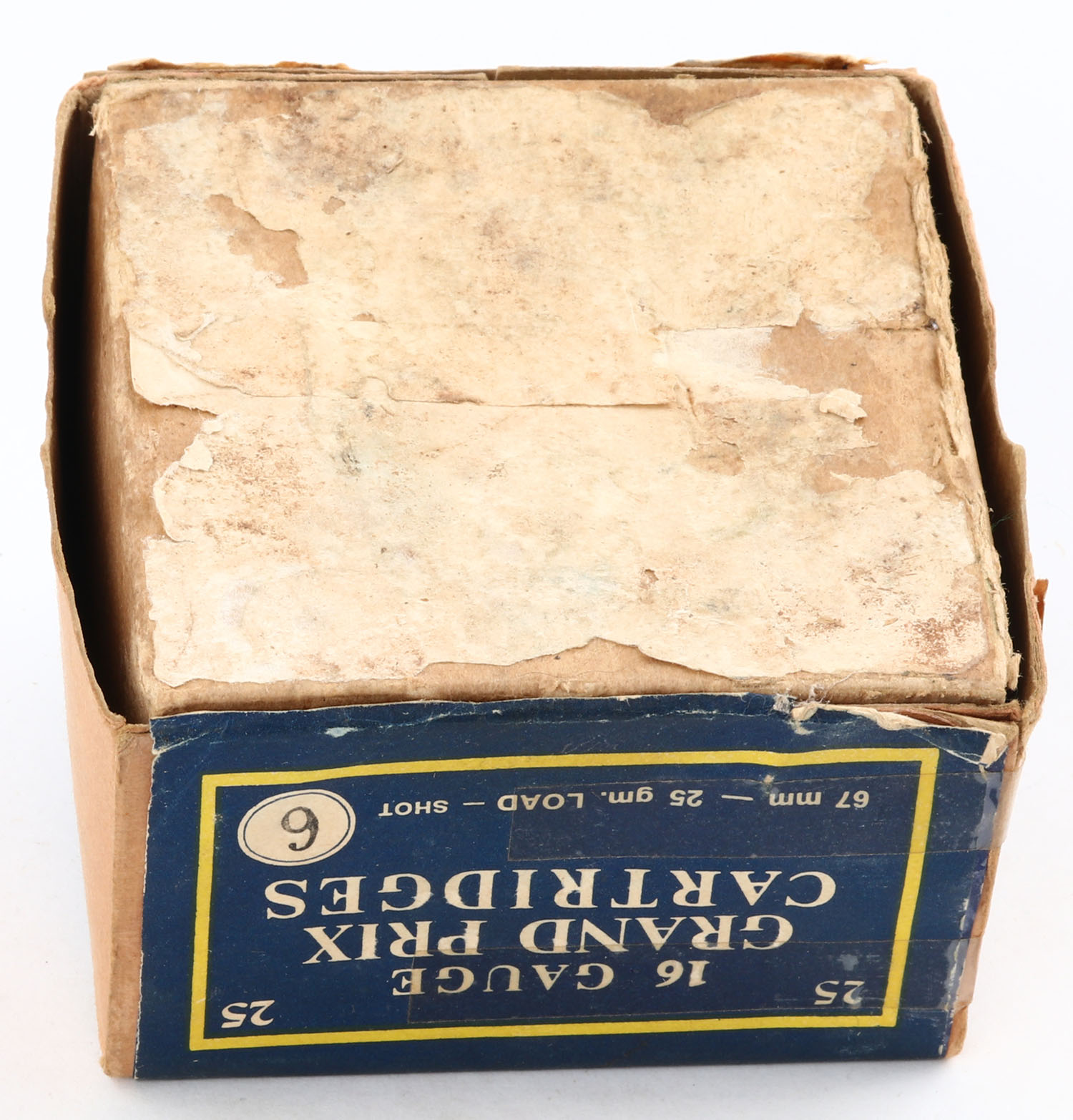 Grand Prix Cartridges, 16ga., 2pc., Empty, shot size 6, buff box with blue, yellow & white label, box has tape repairs to seams and label, box has scuffing with edge wear. Grade: Good ++ - Value: 20 to 100