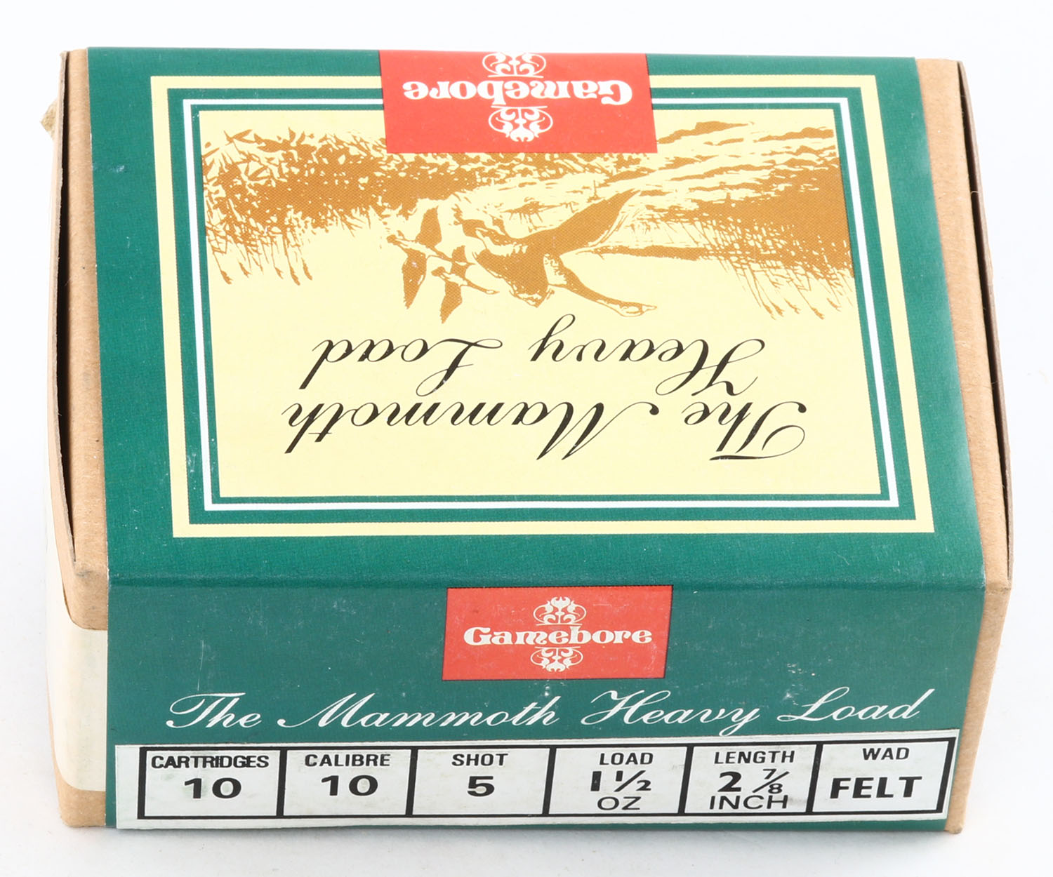 Gamebore, The Mammoth Heavy Load, 10ga., 1pc., Full & Sealed, shot size 5, multi-colored box, box is very solid. Grade: Excellent ++ - Value: 20 to 50