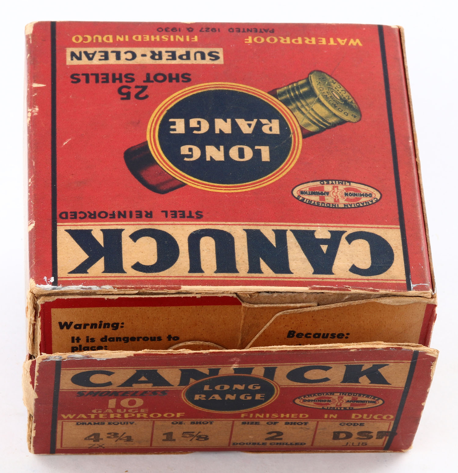CIL, Canuck, 10ga., 1pc., Empty, shot size 2CH., multi-colored box, box has light age soiling with light edge & corner wear, has a seam split to top flap. Grade: Very Good - Value: 10 to 40