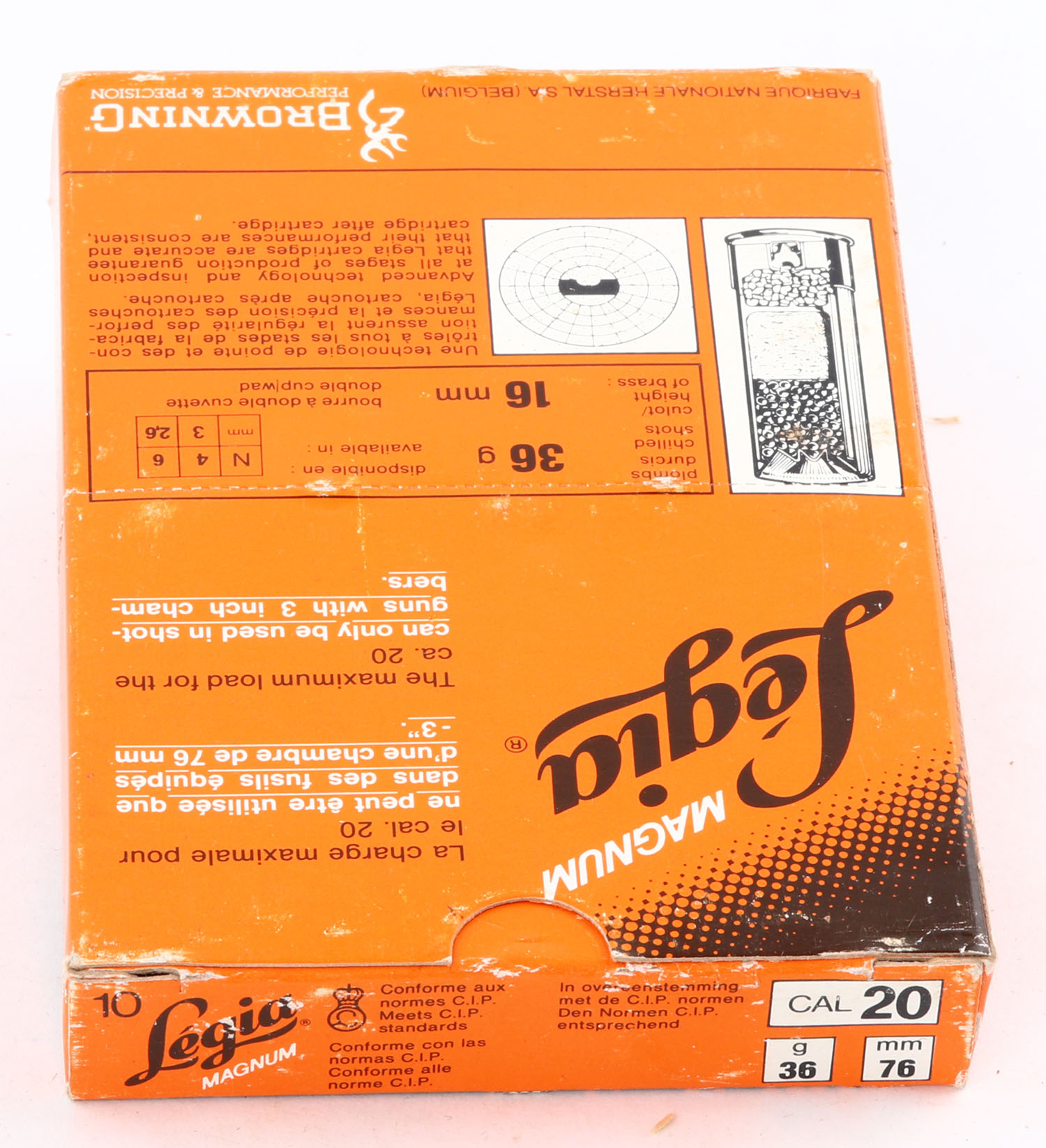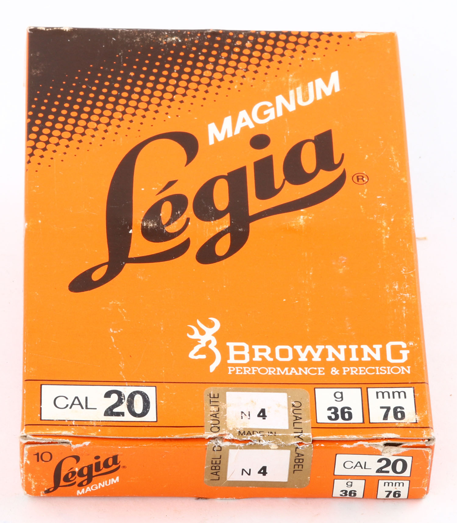 Browning, Legia Magnum, 20ga., 1pc., Full, shot size 4, multi-colored box, box is solid with light scuffing, plastic shells are excellent. Grade: Excellent - Value: 10 to 30