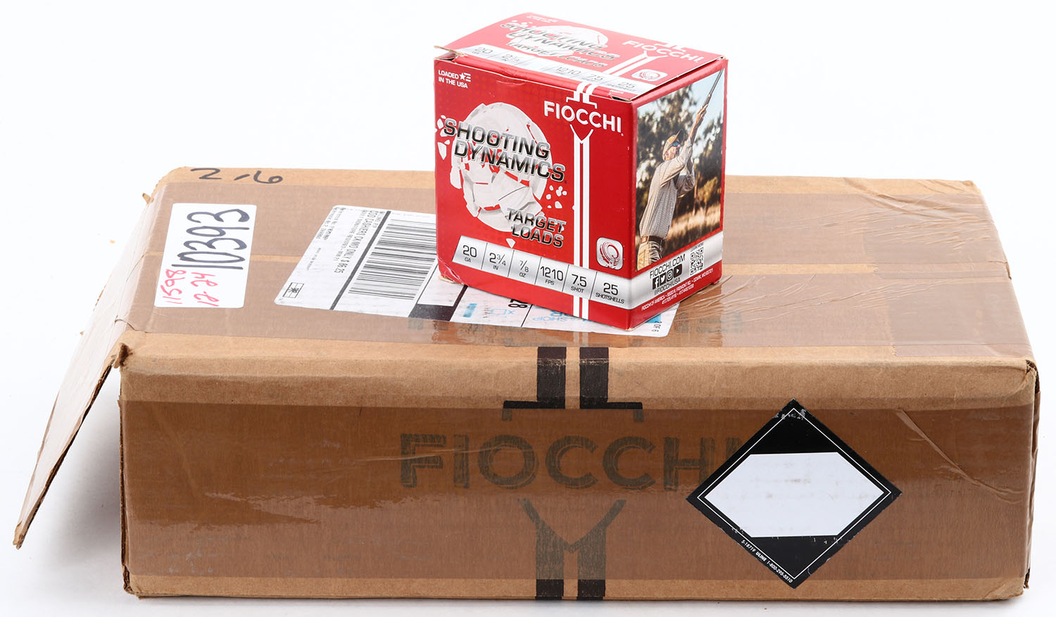 FULL CASE of FIOCCHI, Shooting Dynamics, Target Loads, 20ga., 2 3/4'', shot size 7 1/2, 250rds., has tape wrapped around case. Grade Excellent - Value: 100 to 250