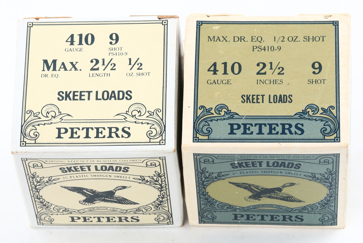 Lot of 2 Peters, Skeet Loads, 410ga., 1pc., Appears Full, shot size 9, 2 1/2'', boxes are very solid, plastic shells are excellent. Grade: Excellent - Value: 40 to 80