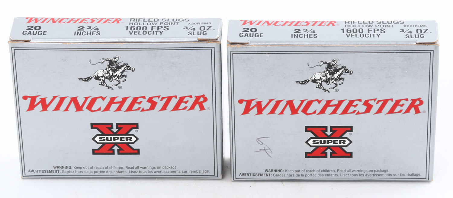 Lot of 2 Winchester, 20ga., 1pc., Appears Full, shot size 3/4 Oz. Slug, multi-colored boxes. Grade: Excellent ++ - Value: 10 to 30