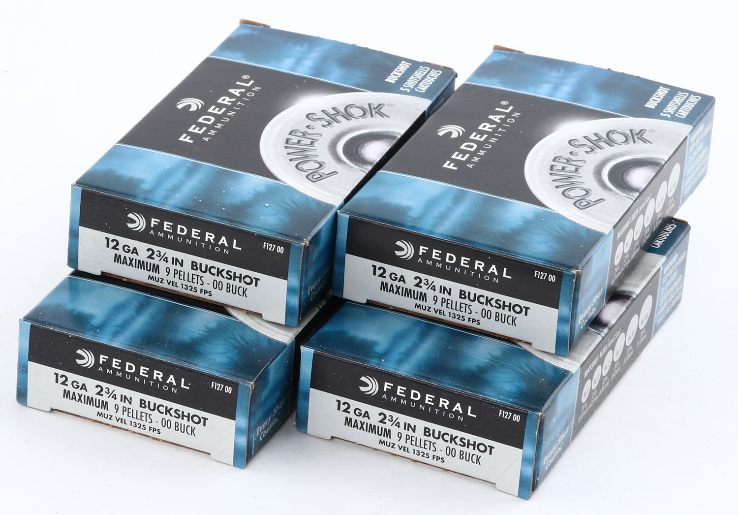 Lot of 4 Federal, 12ga., Appears Full, 2 3/4'', shot size 00 BUCK, multi-colored boxes. Grade: Excellent - Value: 10 to 30