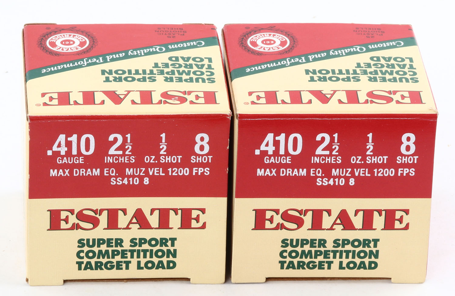 Lot of 2 Estate, 410ga., 1pc., Appears Full, 2 1/2'', shot size 8, multi-colored boxes, boxes are very solid. Grade: Excellent ++ - Value: 20 to 40