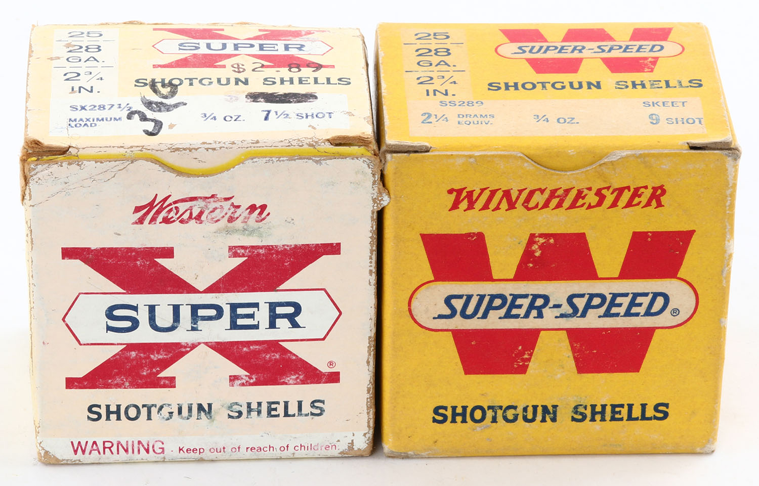 Lot of 2, Mixed Manufacture, 28ga., Appears Full, shot size 7 1/2 & 9 Skeet, Shotshell boxes. Grade: Very Good - Value: 10 to 40
