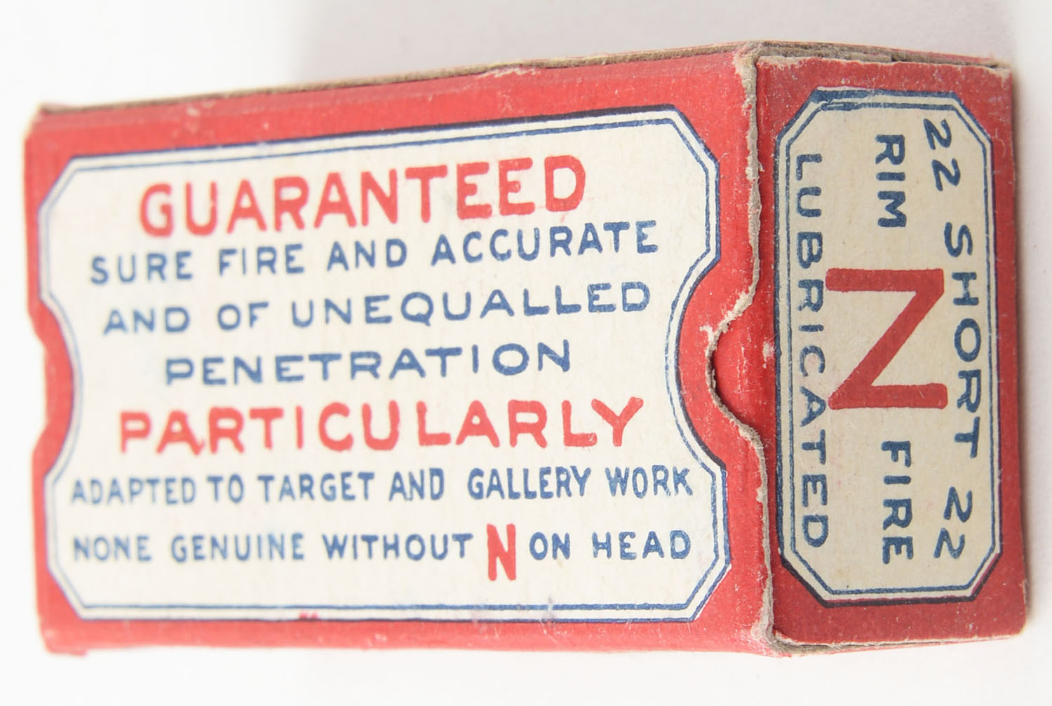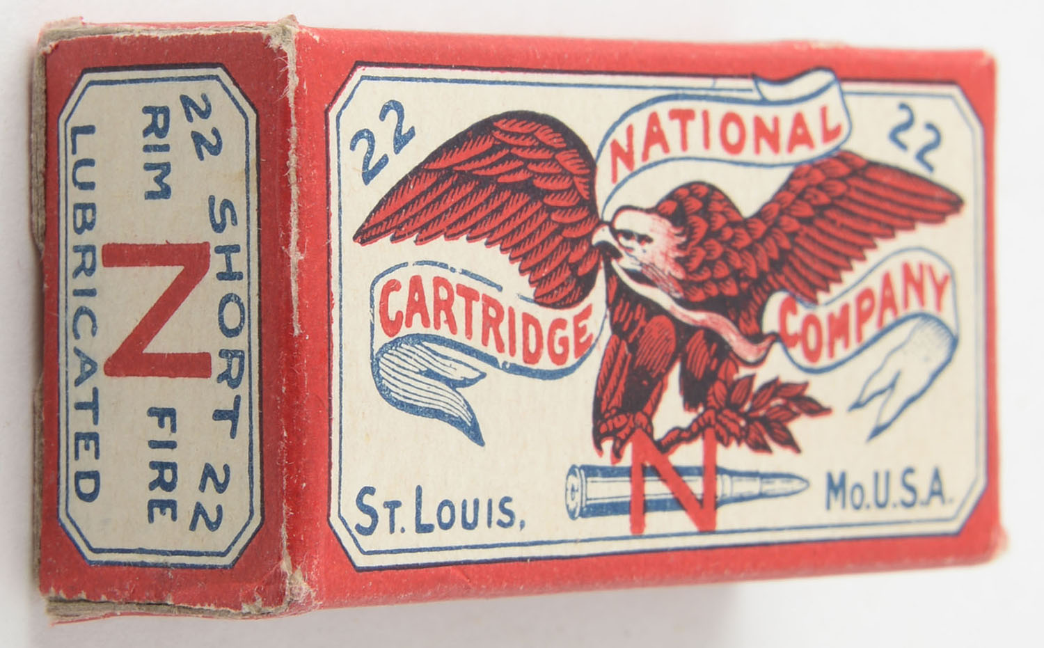 National Cartridge Company, .22 Short, Lubricated, Nublend Powder, RHWeb: NCC-1 S-3, Full, 1pc. White & red box, box is solid with excellent to minty color, minor corner wear, edges are crisp, end flaps are solid, ammo is good. Grade: Excellent + - Value: 350 to 525