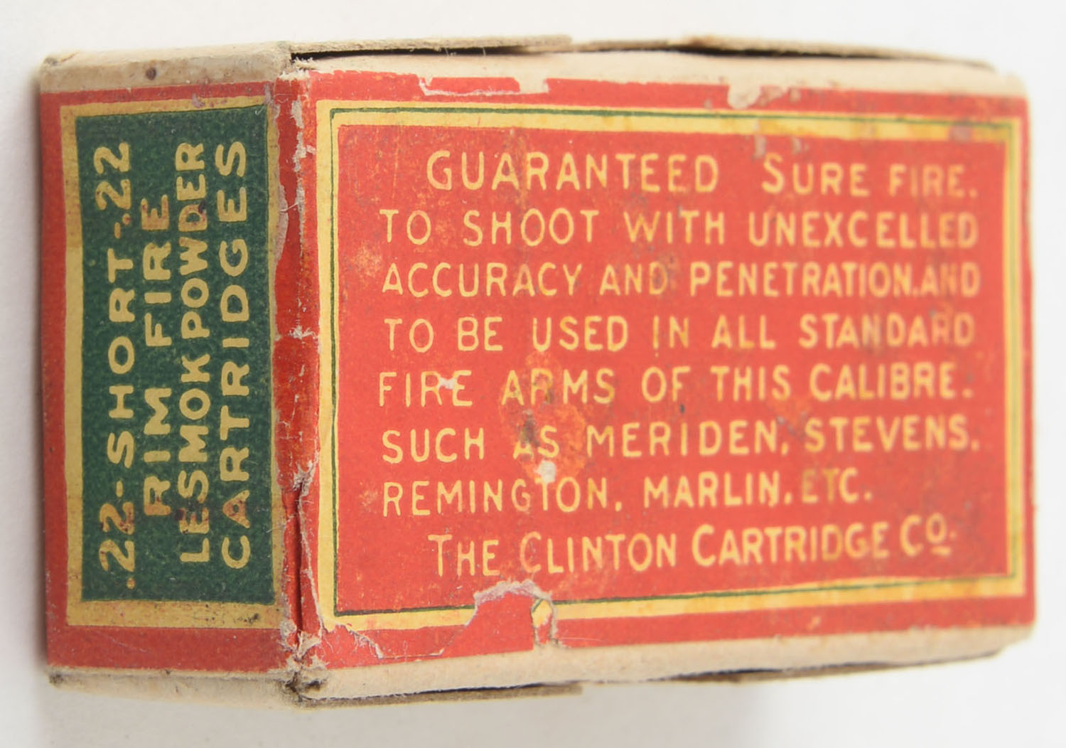 Clinton, Lesmok Powder Cartridges, .22 Short, RHWeb: CLINT-1 S-2.1a, FULL & SEALED, 2pc. Buff box with red wraparound label, box is solid with excellent color, very minor shelf & corner wear, edges are mostly crisp, label is intact. Grade: Excellent + - Value: 100 to 150