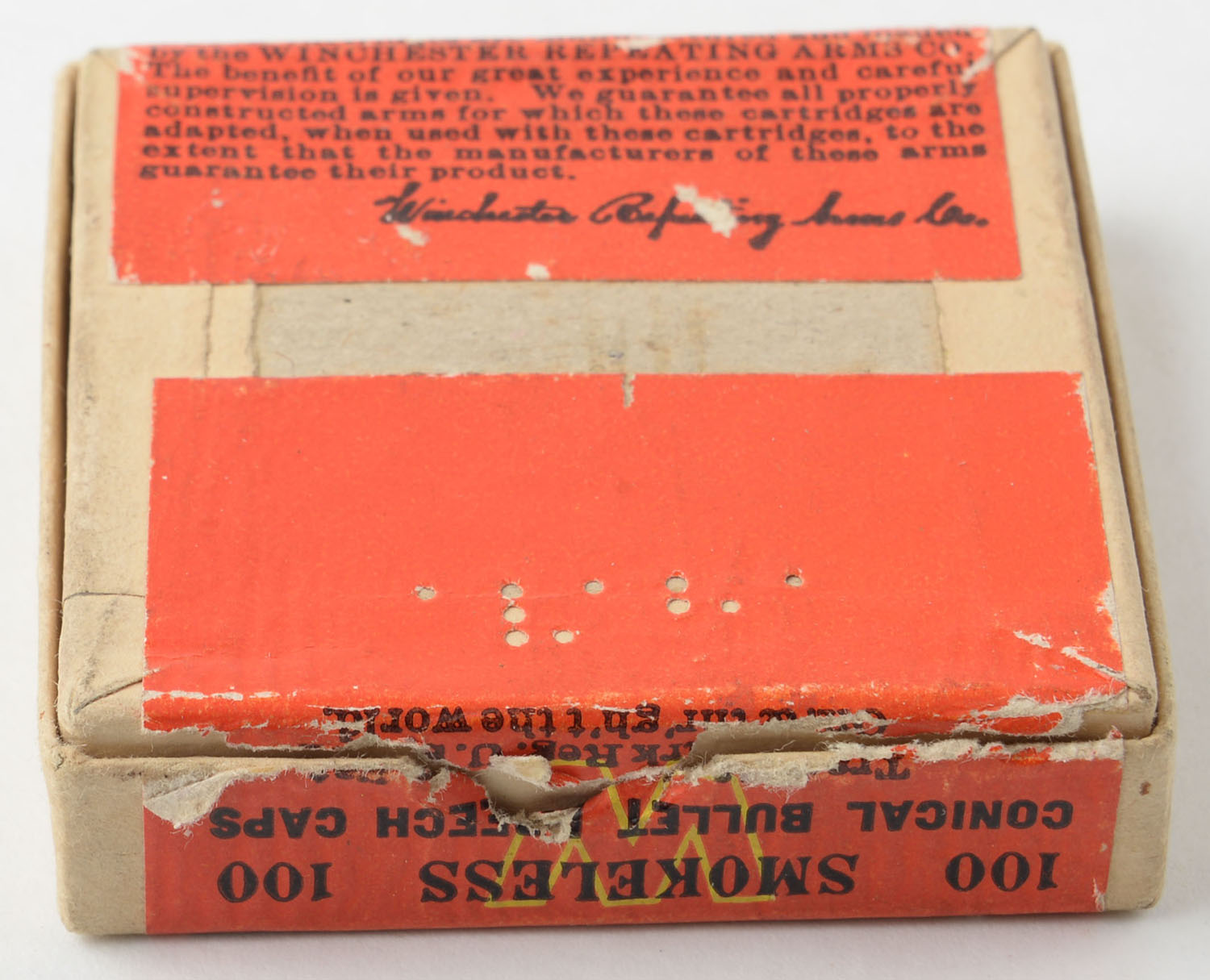 Winchester, Breech Caps, Conical Bullet, .22 Caliber, RR: WRA-29 CB-8, Full, 2pc. Buff box with red wraparound label, box is solid with excellent color, very minor shelf wear, corners are mostly sharp, edges are crisp, label is intact, ammo is excellent. Grade: Excellent + - Value: 250 to 375