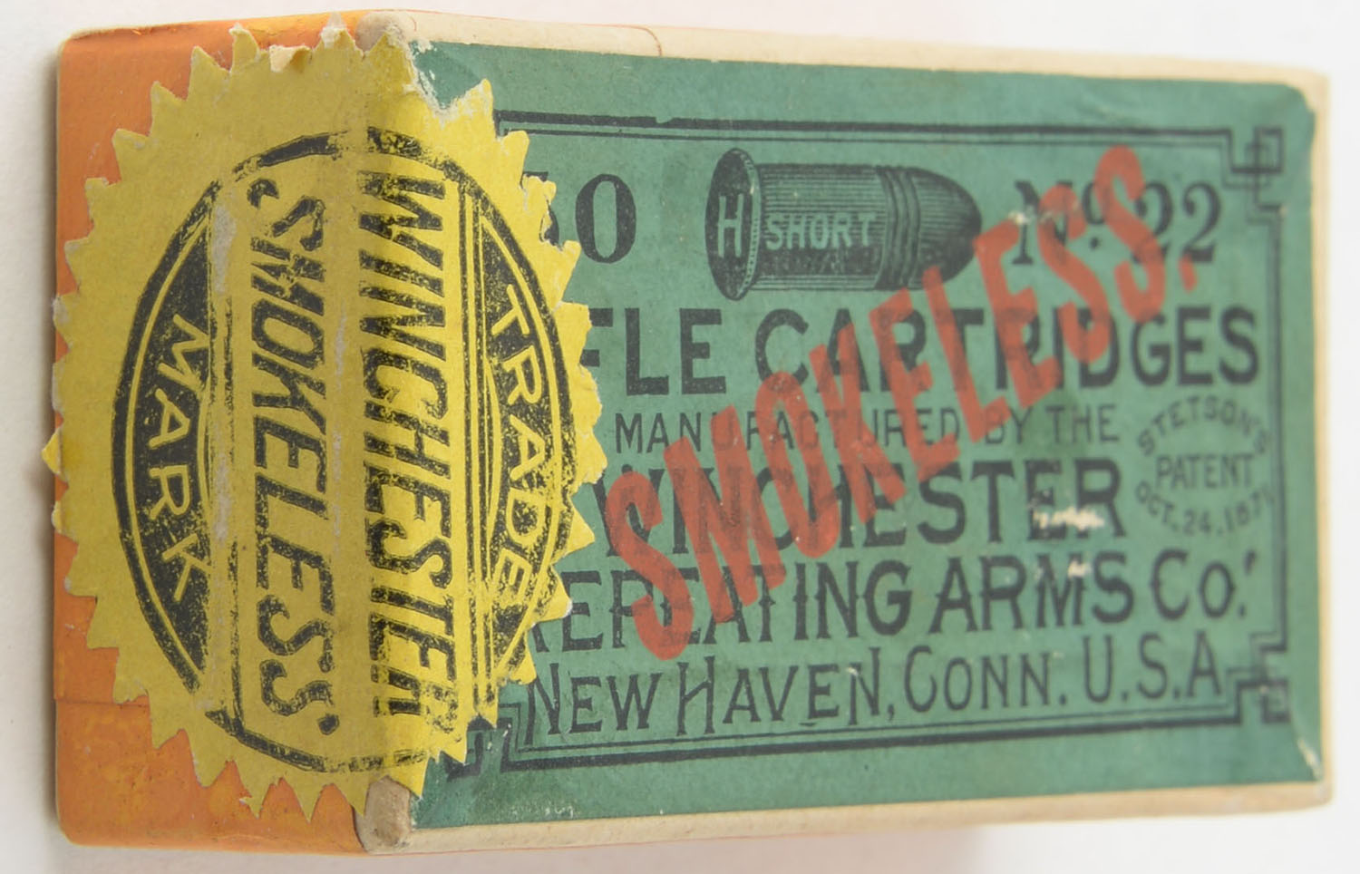 Winchester, Smokeless Rifle Cartridges, .22 Short, RR: WRA-51 S-19a, FULL & SEALED, 2pc. Buff box with green top & orange side sealing labels, red ''SMOKELESS'' over-stamp on top, large sunburst on left end, box is solid with excellent color, only very minor age soiling & shelf wear, corners are mostly sharp, edges are crisp, labels are intact. Grade: Excellent ++ - Value: 400 to 600