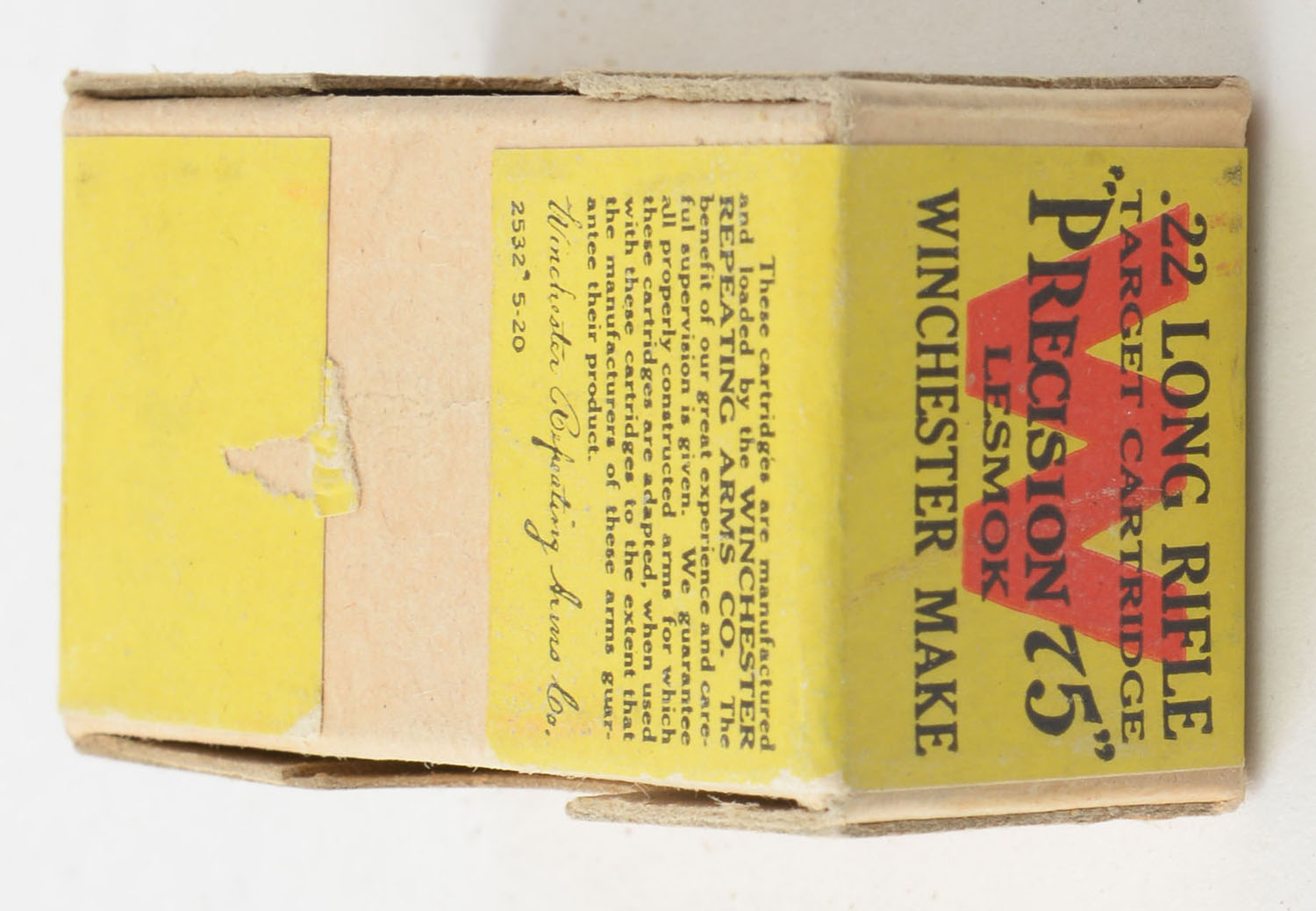 Winchester, ''Precision 75'', .22 Long Rifle, Lesmok, RR: WRA-129 LR-41, FULL & SEALED, 2pc. Buff box with gray yellow & red wraparound label, box is MINT with minty color, corners are sharp, edges are crisp, label is intact. Grade: MINT - Value: 100 to 150