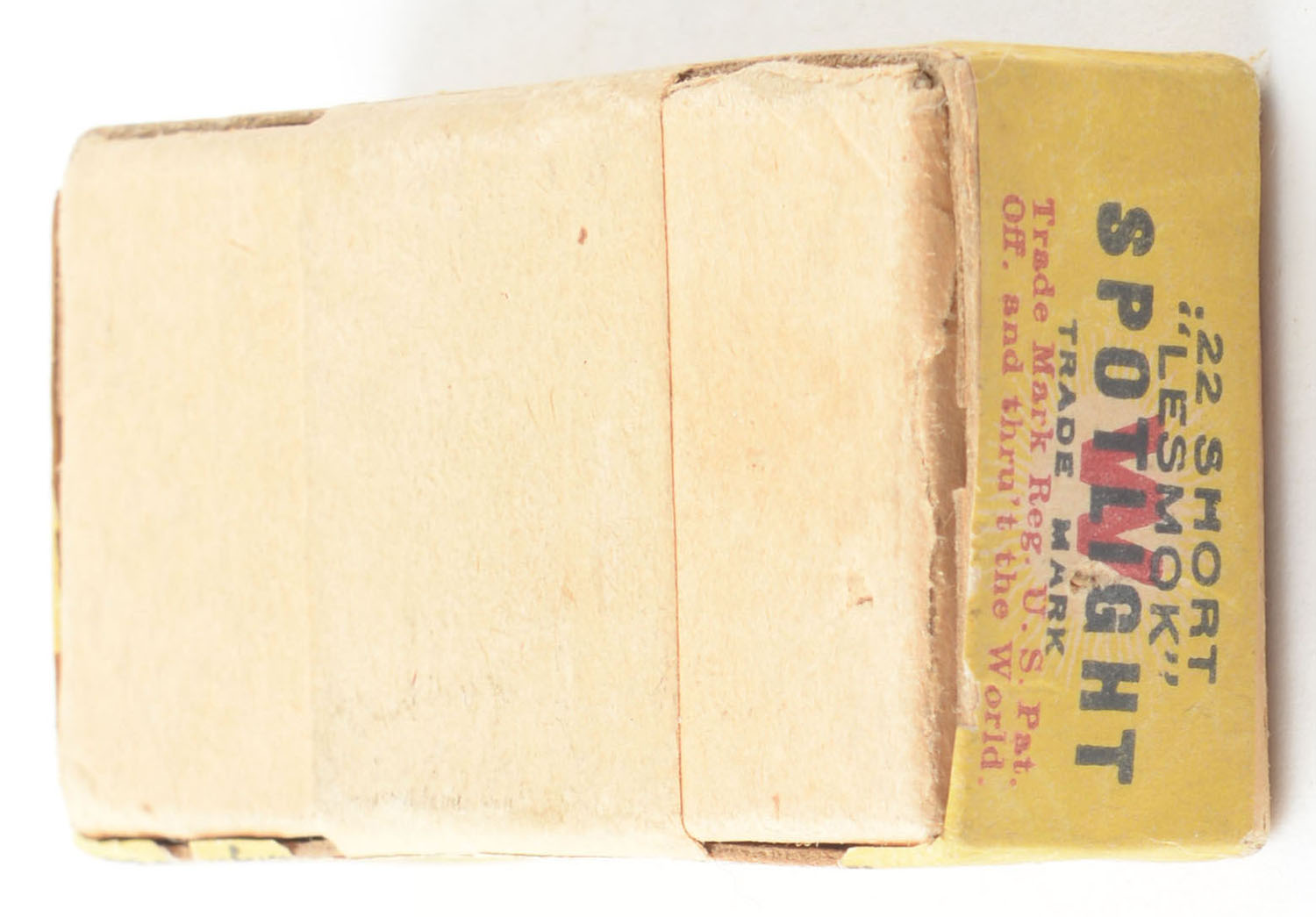 RARE! Winchester, Spotlight, .22 Short, ''Lesmok'' Powder, RR: WRA-77 SS-1b, FULL & SEALED, 2pc. Buff box with green top & yellow side sealing labels, box is solid with excellent color, very minor age soiling & corner wear, edges are mostly crisp, labels are intact. Grade: Excellent + - Value: 1500 to 2250