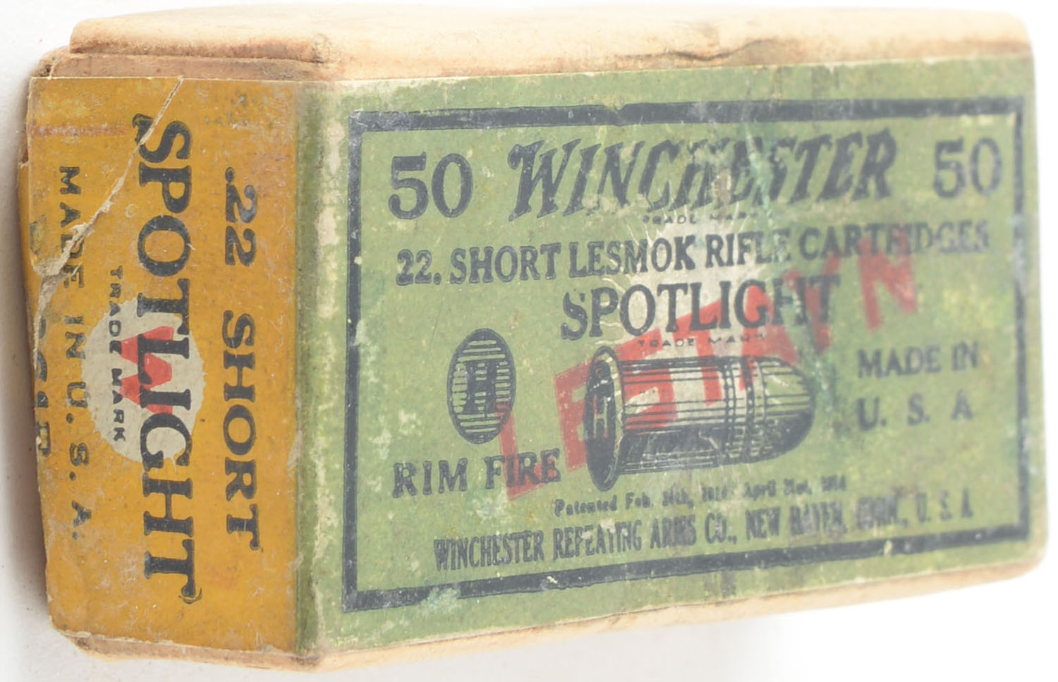 Winchester, Lestayn Spotlight, .22 Short, Lesmok, RR: WRA-81 SS-9, Full, 2pc. Buff box with green & yellow wraparound label, red ''Lestayn'' over-stamp, box is solid with very good color, some age soiling & shelf wear, minor edge & corner wear, label is intact, ammo is very good. Grade: Very Good + - Value: 200 to 300