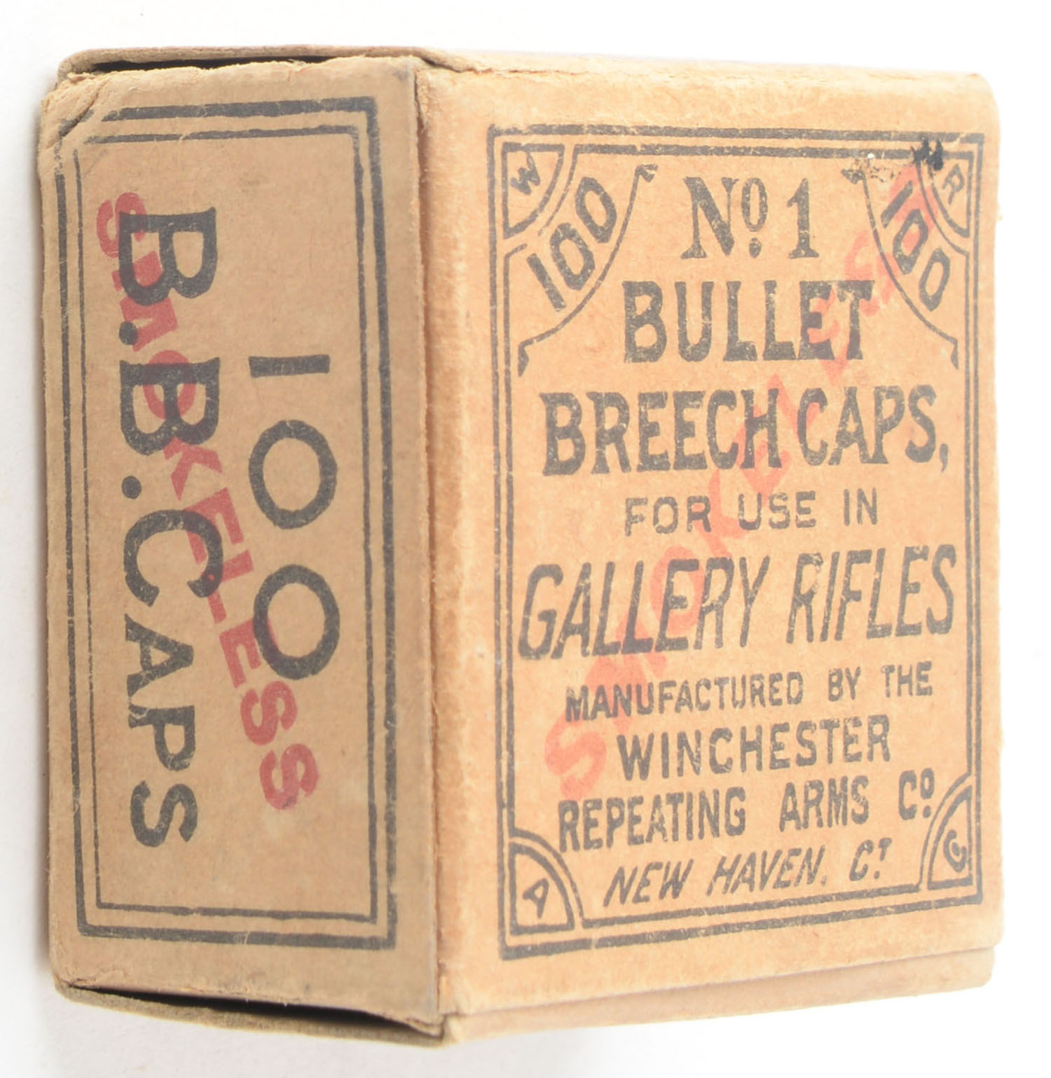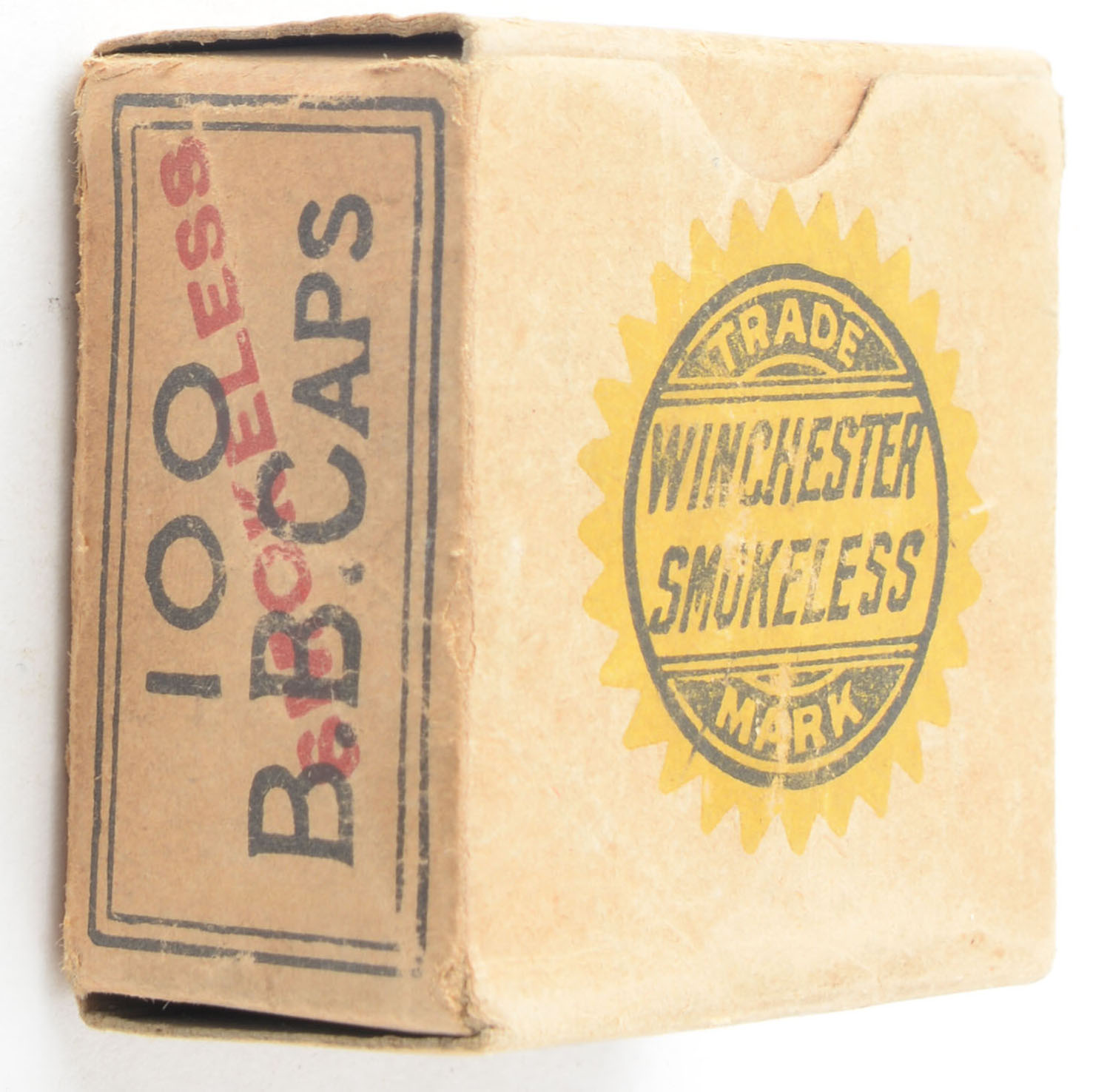 Winchester, Bullet Breech Caps, Smokeless, RR: WRA-25 BB-5b, Full, 1pc. Buff box with black printing, red ''Smokeless'' over-stamp, box is solid with excellent color, very minor age soiling & corner wear, edges are mostly crisp, end flaps are solid, ammo is very good. Grade: Excellent - Value: 200 to 300