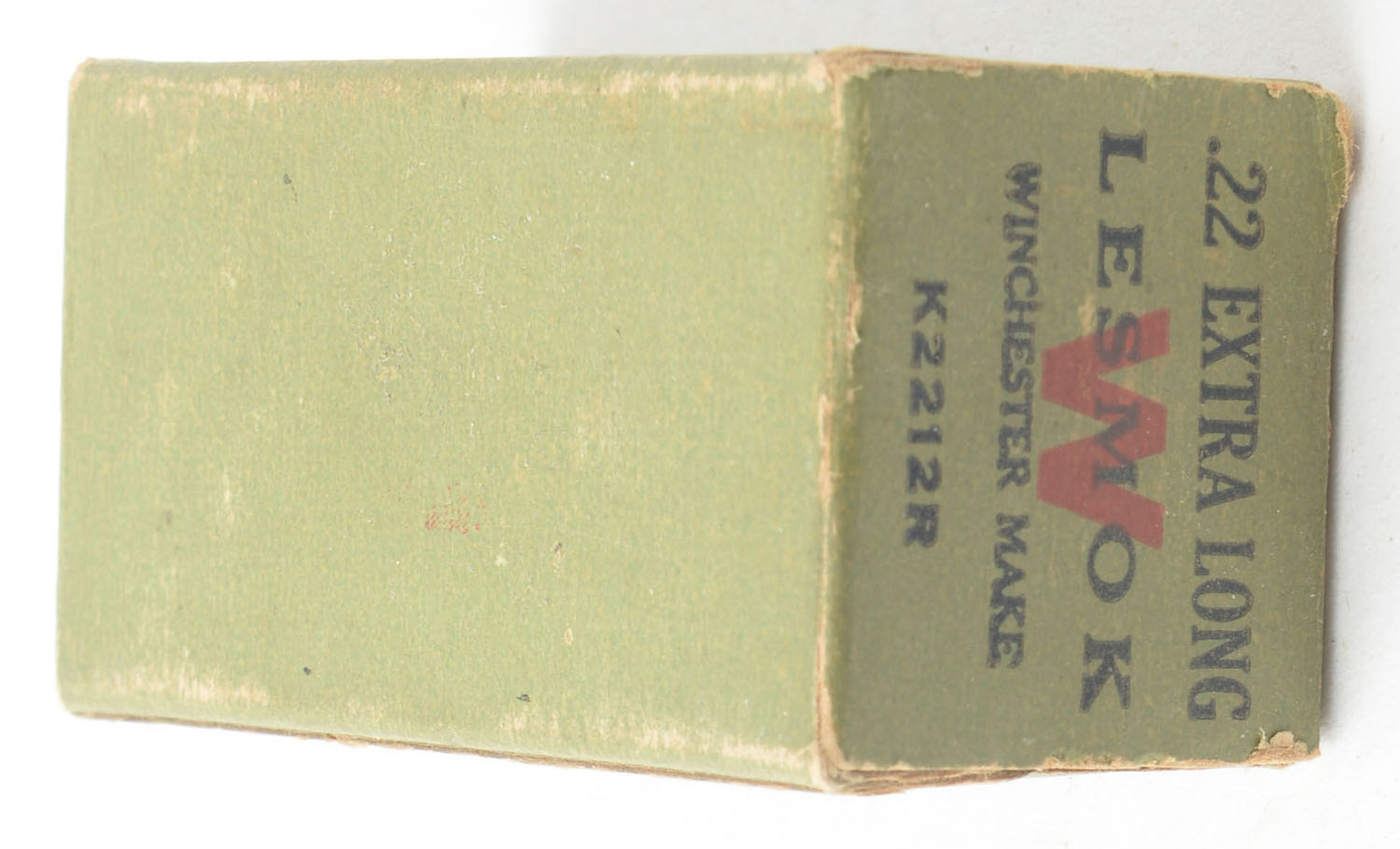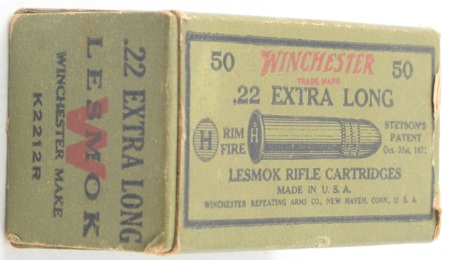 RARE! Winchester, Lesmok Rifle Cartridges, .22 Extra Long, RHWeb: WRA-11A XL-1, Partial 47rds. 1pc. Green black & red box, box is solid with excellent color, minor shelf & corner wear, very minor edge wear, end flaps are solid, ammo is good. Grade: Very Good ++ - Value: 400 to 600
