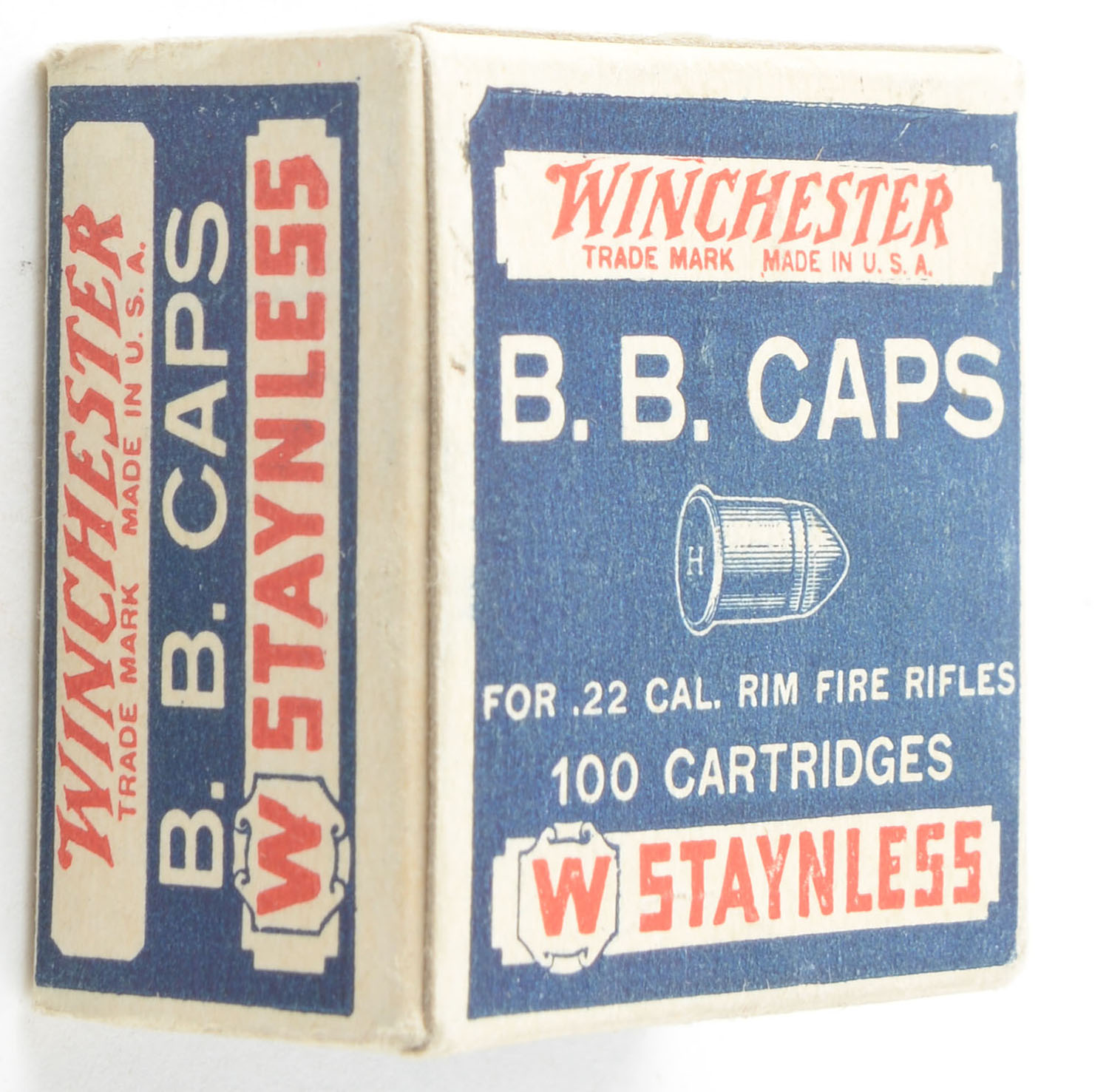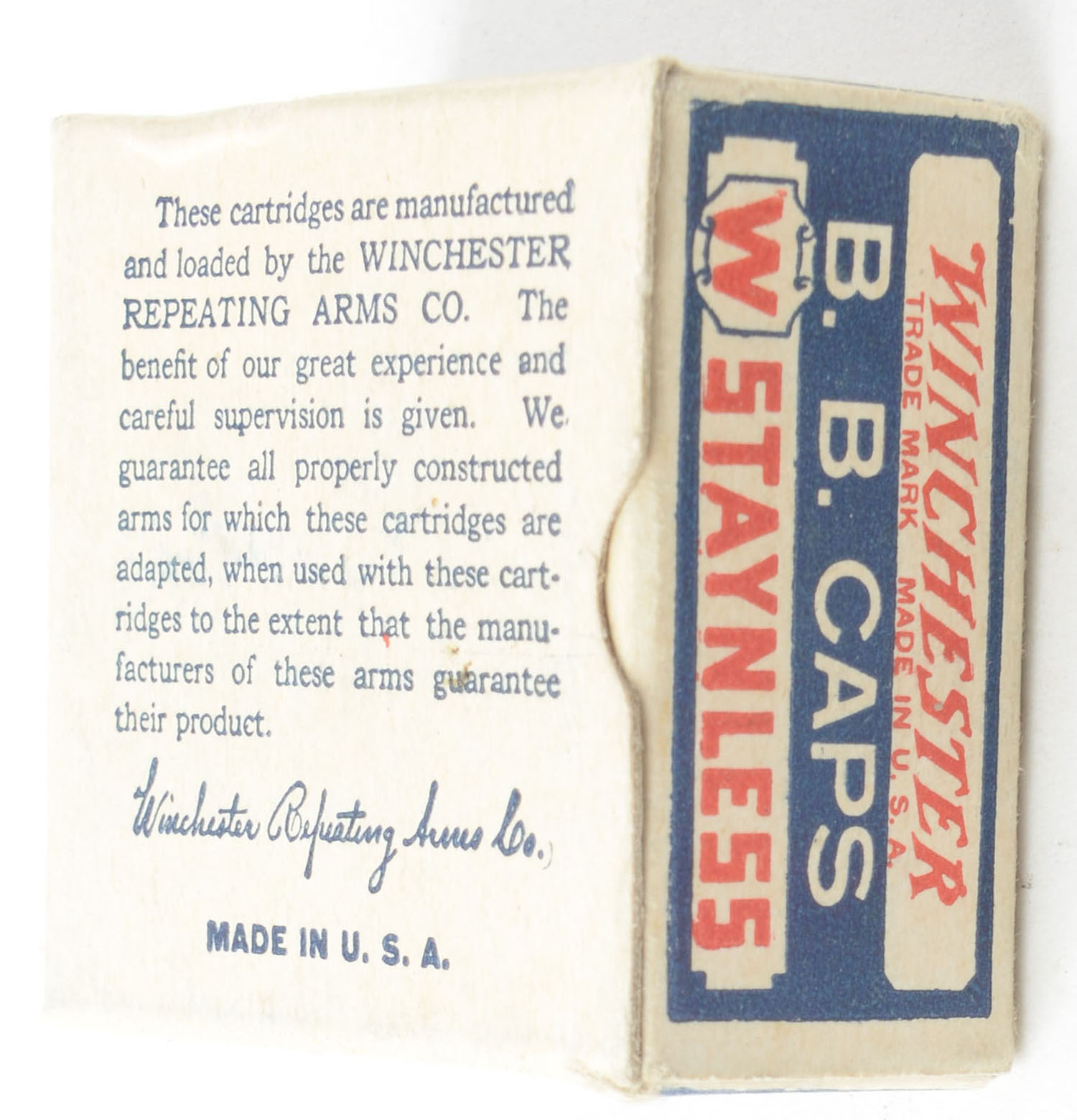 Winchester, Staynless, B.B. Caps, RHWeb: WRA-12B BB-1, Full, 1pc. Blue white & red box, box is solid with excellent color, only very minor corner wear, edges are crisp, end flaps are solid, ammo is excellent. Grade: Excellent ++ - Value: 50 to 75