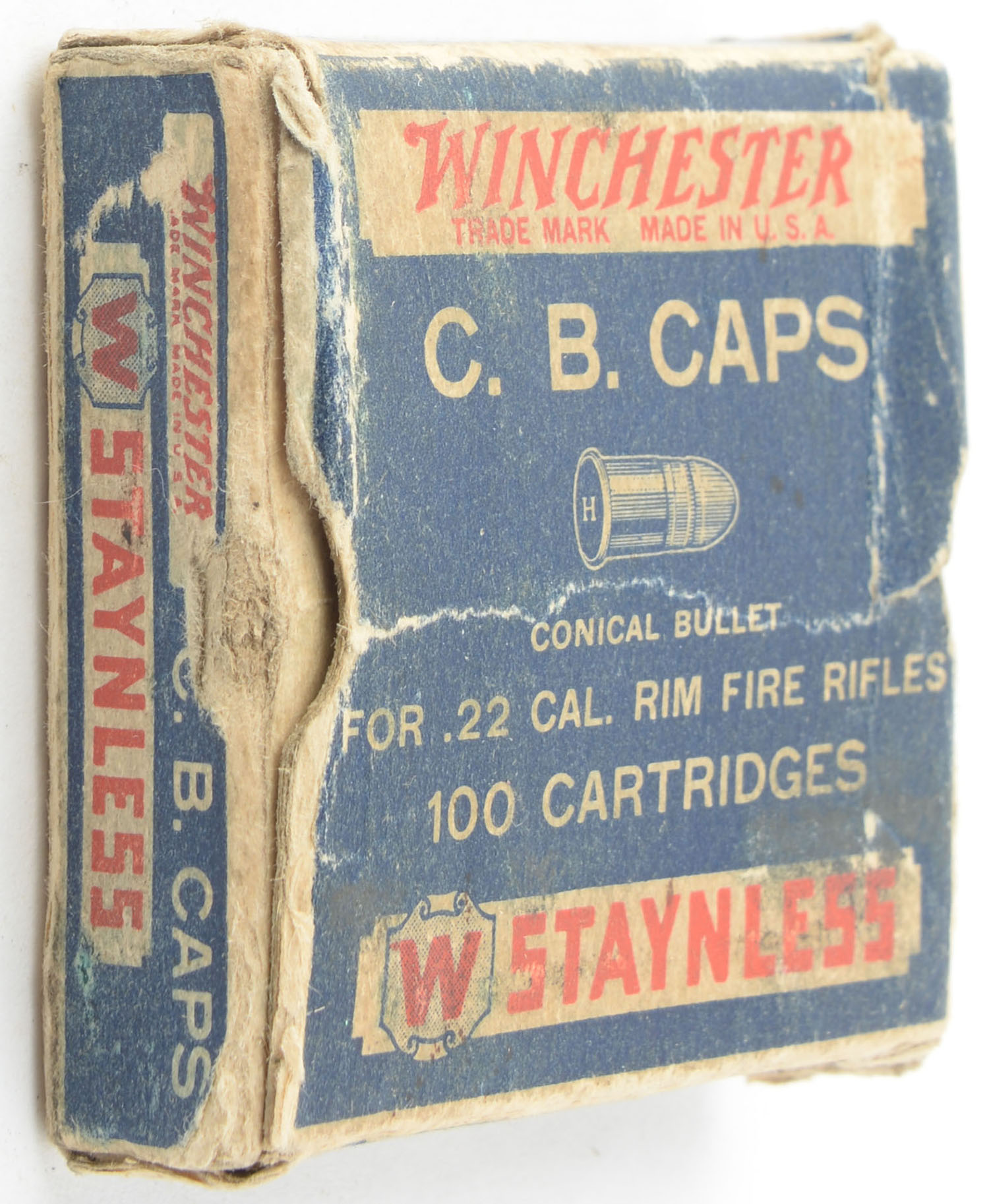 Winchester, Staynless, C.B. Caps, Conical Bullet, Not in RHWeb, but is where WRA-12B CB-3 should be (bottom pictured only, but not numbered), Partial approx 85rds. 1pc. Blue white & red box, box is solid with good color, age soiling, crease across top, corner wear, some shelf & edge wear, end flaps are solid, ammo is very good. Grade: Good - Value: 100 to 150