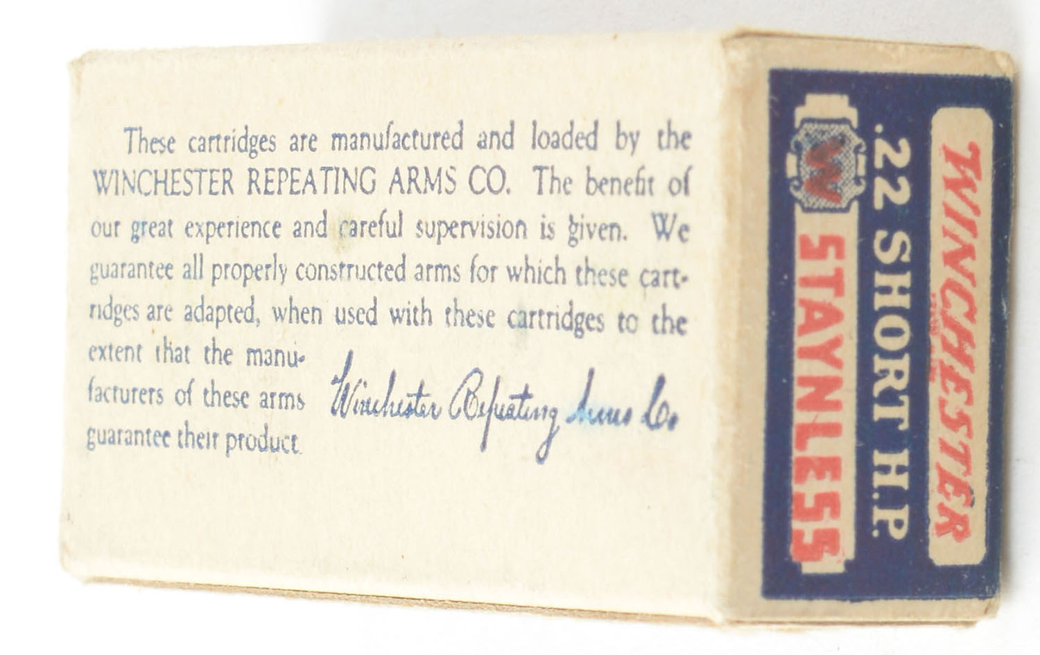 Winchester, Staynless, .22 Short Hollow Point, RHWeb: WRA-12A S-2, Full, 1pc. Blue white & red box, box is solid with excellent color, very minor corner wear, edges are mostly crisp, end flaps are solid, ammo is good to very good. Grade: Excellent + - Value: 200 to 300