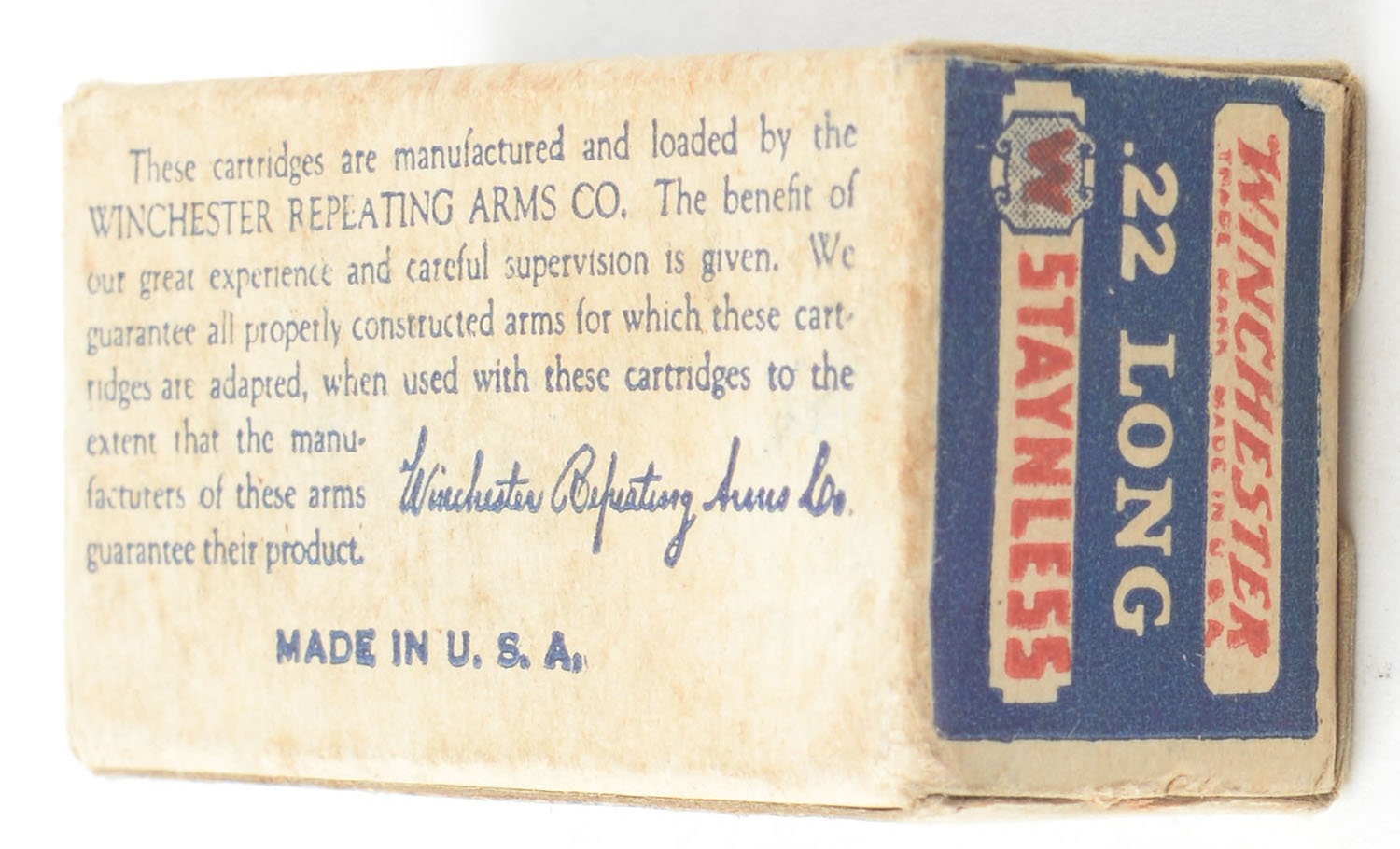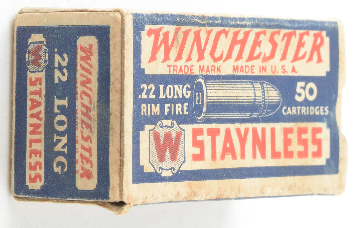 Winchester, Staynless, .22 Long, RHWeb: WRA-12B L-1b, Full, 1pc. Blue white & red box, box is solid with very good color, minor age soiling, stain on top, some corner wear, edges are mostly crisp, end flaps are solid, ammo is very good. Grade: Very Good ++ - Value: 70 to 100