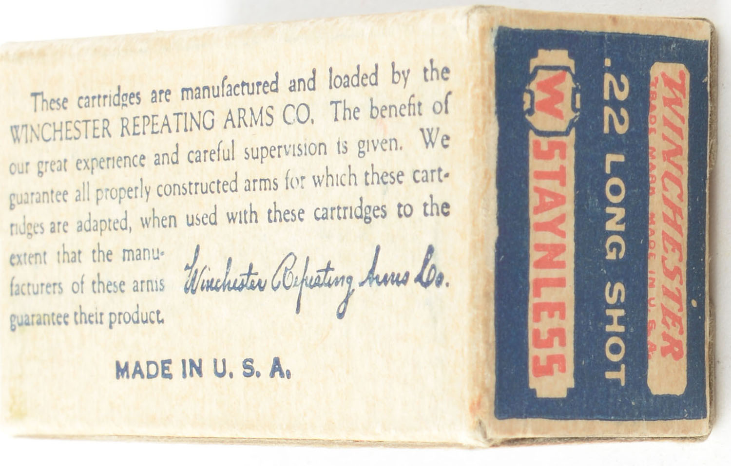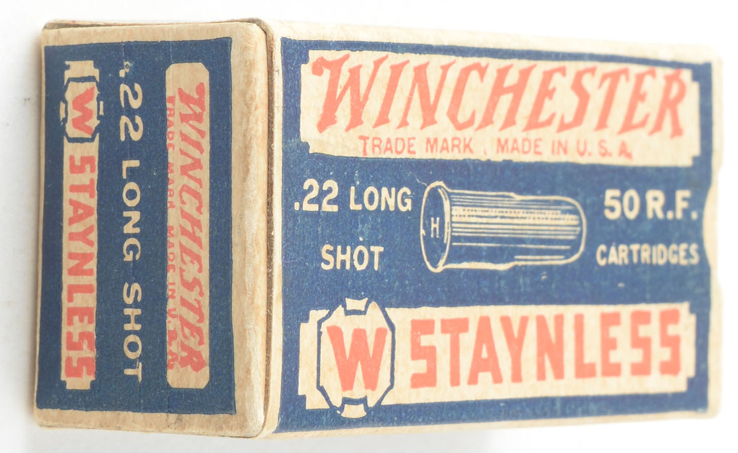 Winchester, Staynless, .22 Long Shot, RHWeb: WRA-12B L-3Bc, Full, 1pc. Blue white & red box, box is solid with excellent color, very minor age soiling & corner wear, edges are crisp, end flaps are solid, ammo is excellent. Grade: Excellent + - Value: 150 to 225