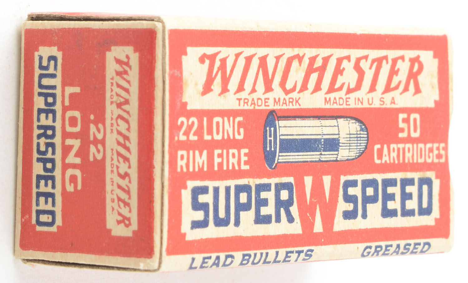 Winchester, Super Speed, .22 Long, Lead Bullets Greased, RHWeb: WRA-13 L-2b, Full, 1pc. Red white & blue box, box is solid with excellent color, very minor staining on top, corners are mostly sharp, edges are crisp, end flaps are solid, ammo is excellent. Grade: Excellent - Value: 200 to 300