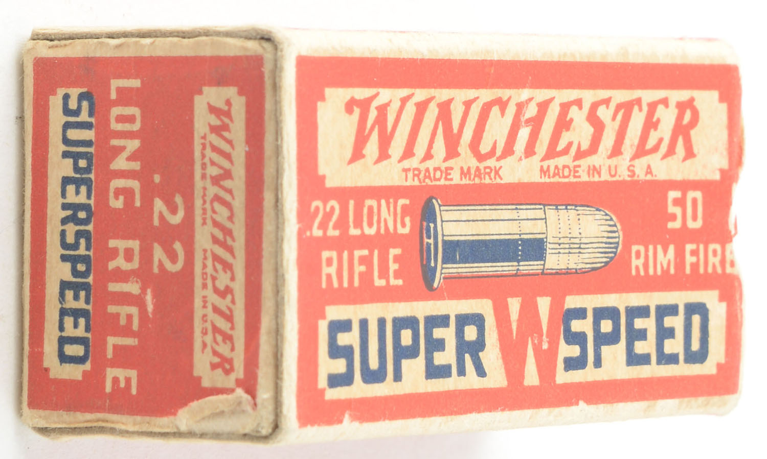 Winchester, Super Speed, .22 Long Rifle, RHWeb: WRA-13 LR-1c, Partial 25rds. 1pc. Red white & blue box, box is solid with excellent color, minor age soiling & corner wear, edges are crisp, end flaps are solid, ammo is excellent. Grade: Very Good ++ - Value: 20 to 30