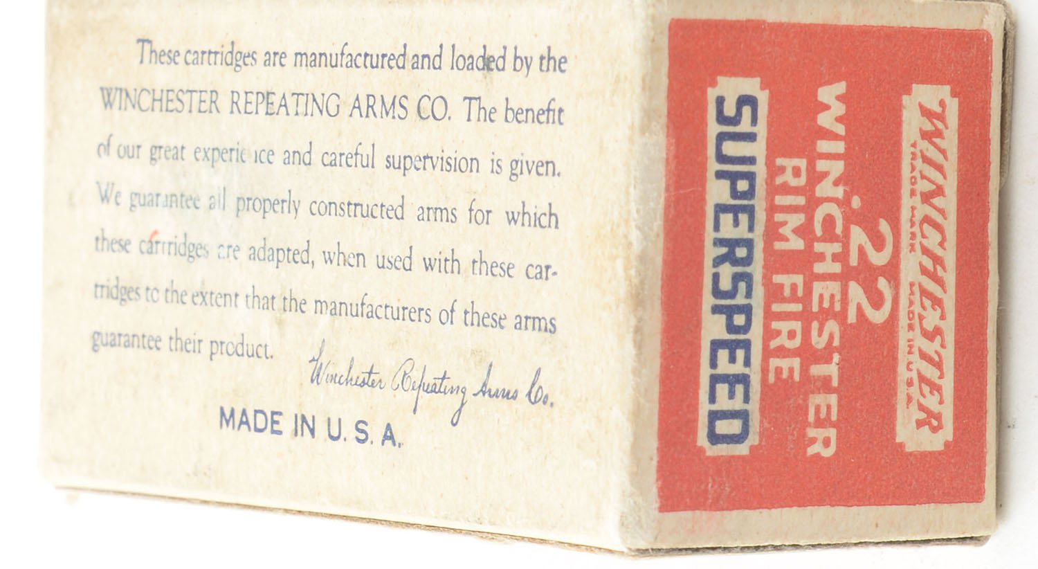 Winchester, Super Speed, .22 W.R.F., RHWeb: WRA-13 WRF-1c, Full, 1pc. Red white & blue box, box is solid with excellent color, minor age soiling on bottom, corners are mostly sharp, edges are crisp, end flaps are solid, ammo is excellent to minty. Grade: Excellent ++ - Value: 120 to 180