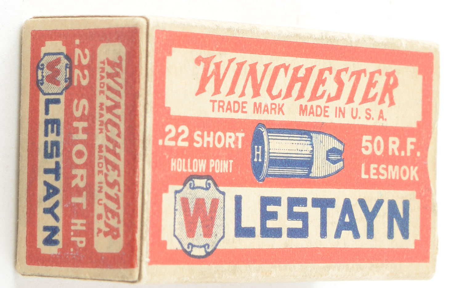 Winchester, Lestayn, .22 Short Hollow Point, RHWeb: WRA-13.5 S-2a, Full, 1pc. Red white & blue box, box is solid with very good to excellent color, minor age soiling & corner wear, edges are mostly crisp, end flaps are solid, ammo is excellent. Grade: Excellent - Value: 600 to 900