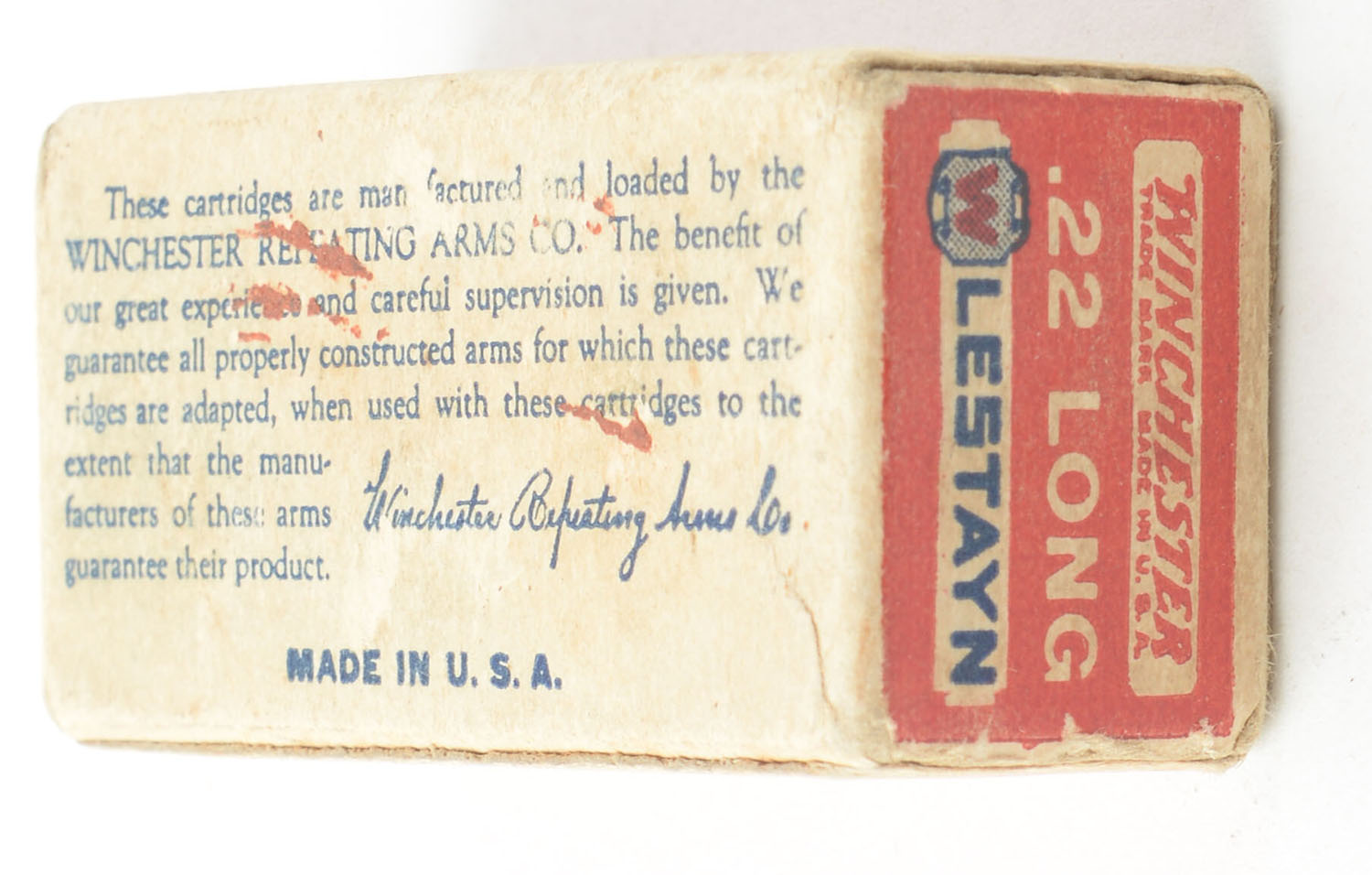 Winchester, Lestayn, .22 Long, RHWeb: WRA-13.5 L-1a, Full, 1pc. Red white & blue box, box is solid with very good color, some age soiling, some edge & corner wear, end flaps are solid, ammo is fair. Grade: Very Good + - Value: 150 to 225