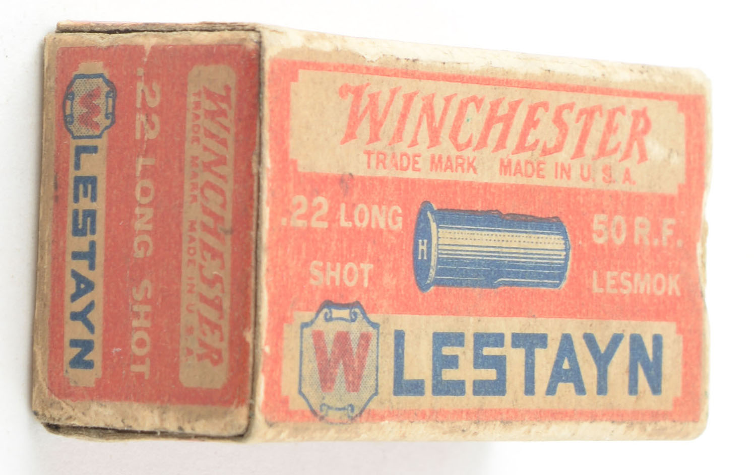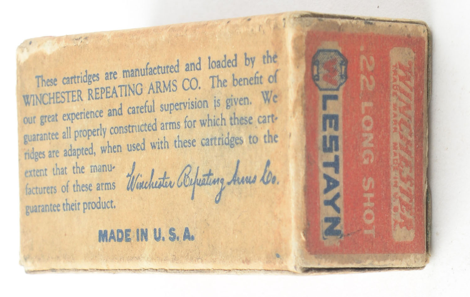 Winchester, Lestayn, .22 Long Shot, RHWeb: WRA-13.5 L-3a, Partial 45rds. 1pc. Red white & blue box, box is solid with good color, age soiling, some staining, some edge & corner wear, end flaps are solid, ammo is fair. Grade: Good ++ - Value: 120 to 180