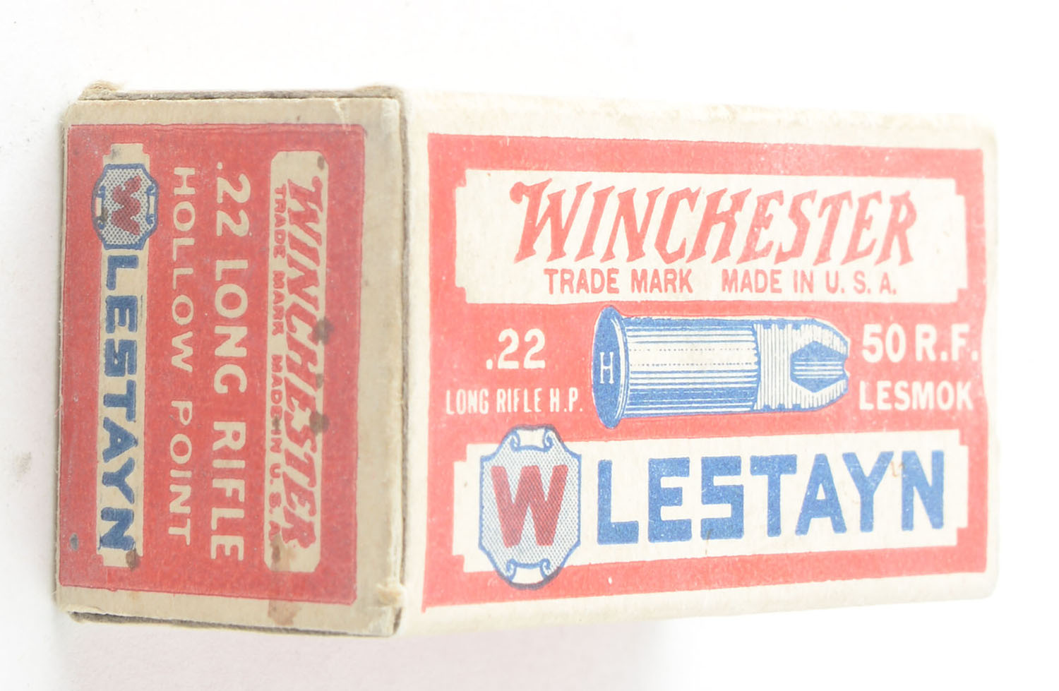 Winchester, Lestayn, .22 Long Rifle Hollow Point, RHWeb: WRA-13.5 LR-2a, Full, 1pc. Red white & blue box, box is solid with excellent color, very minor color fading & corner wear, edges are crisp, end flaps are solid, ammo is good. Grade: Excellent ++ - Value: 250 to 375