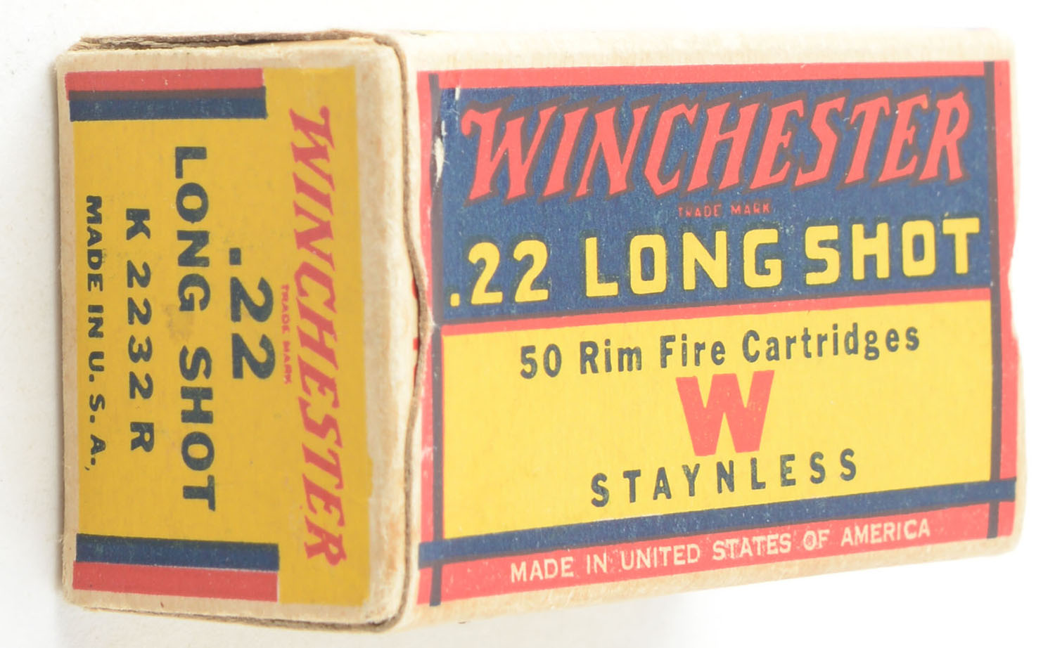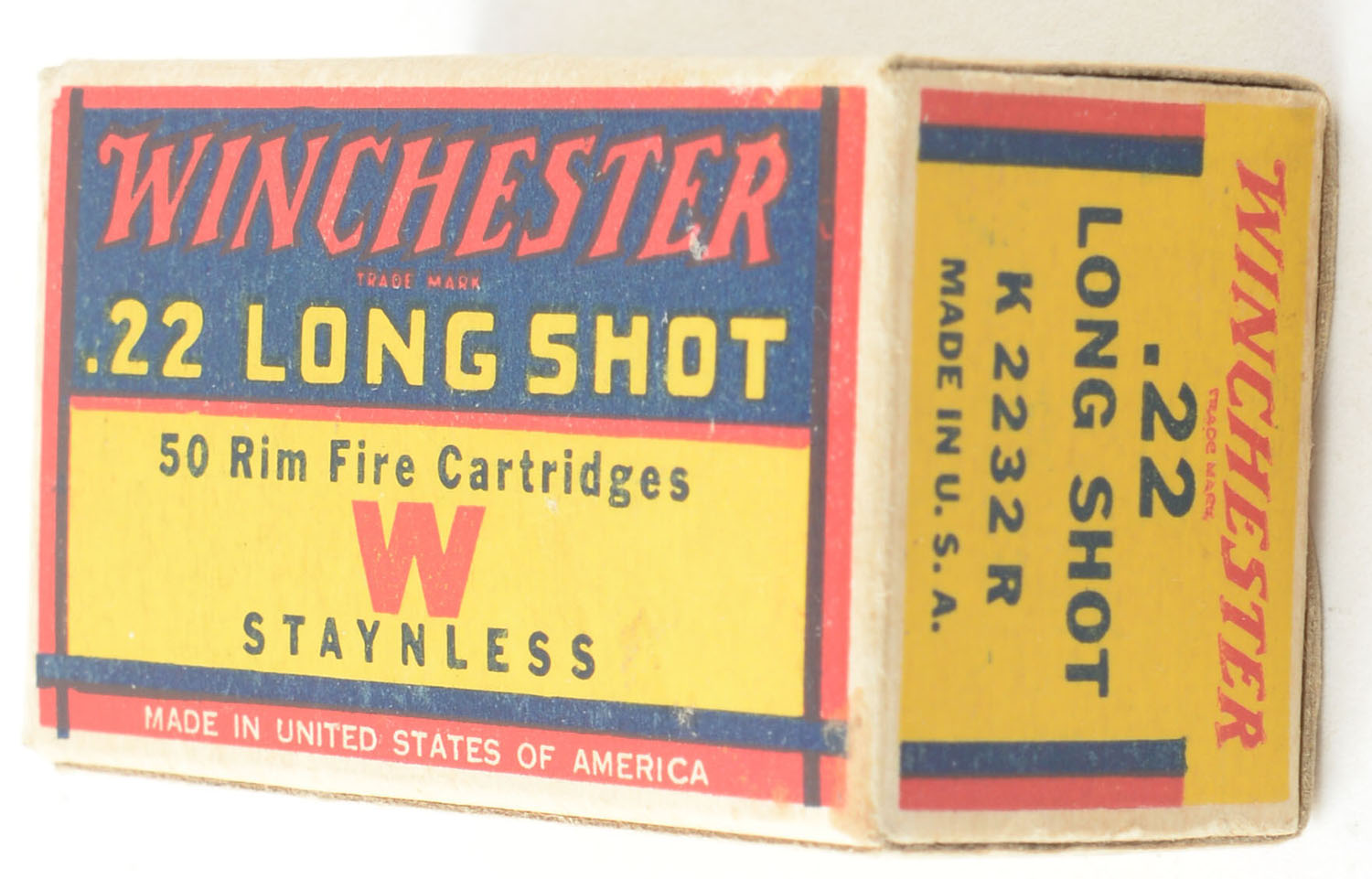Winchester, Staynless, .22 Long Shot, RHWeb: WRA-15 L-5b, Full, 1pc. Yellow blue & red box, box is solid with excellent color, minor corner wear, very minor edge wear, end flaps are solid, ammo is excellent. Grade: Excellent - Value: 70 to 100