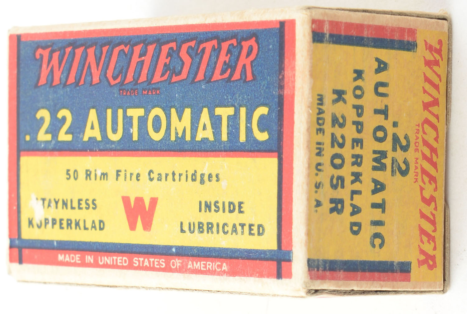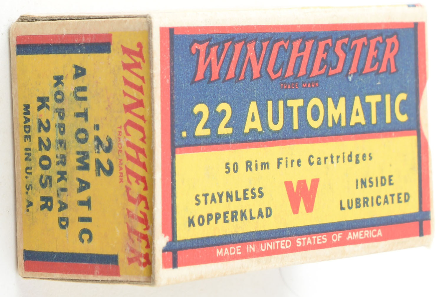 Winchester, Staynless Kopperklad, .22 Automatic, Inside Lubricated, RHWeb: WRA-15 WA-1b, Full, 1pc. Yellow blue & red box, box is solid with excellent color, very minor shelf & corner wear, edges are crisp, end flaps are solid, ammo is excellent. Grade: Excellent + - Value: 50 to 75