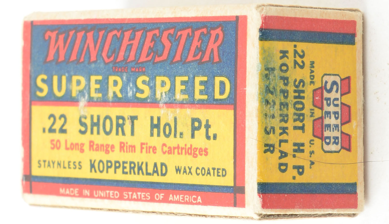 Winchester, Super Speed, .22 Short Hollow Point, RHWeb: WRA-15 S-2b, Full, 1pc. Yellow blue & red box, box is solid with excellent color, minor corner wear, edges are mostly crisp, end flaps are solid, ammo is excellent to minty. Grade: Excellent + - Value: 40 to 60