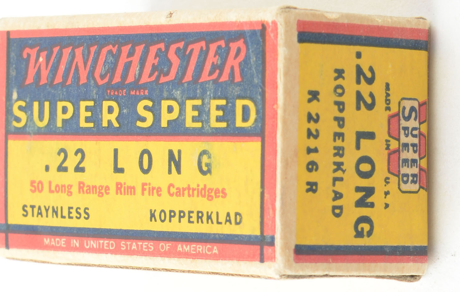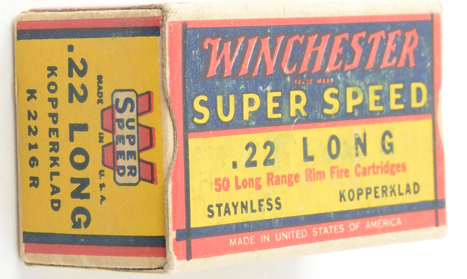 Winchester, Super Speed, .22 Long, Staynless Kopperklad, RHWeb: WRA-15 L-1b, Full, 1pc. Yellow blue & red box, box is solid with very good color, some shelf wear & color bleeding, very minor corner wear, edges are crisp, end flaps are solid, ammo is excellent. Grade: Very Good ++ - Value: 20 to 30