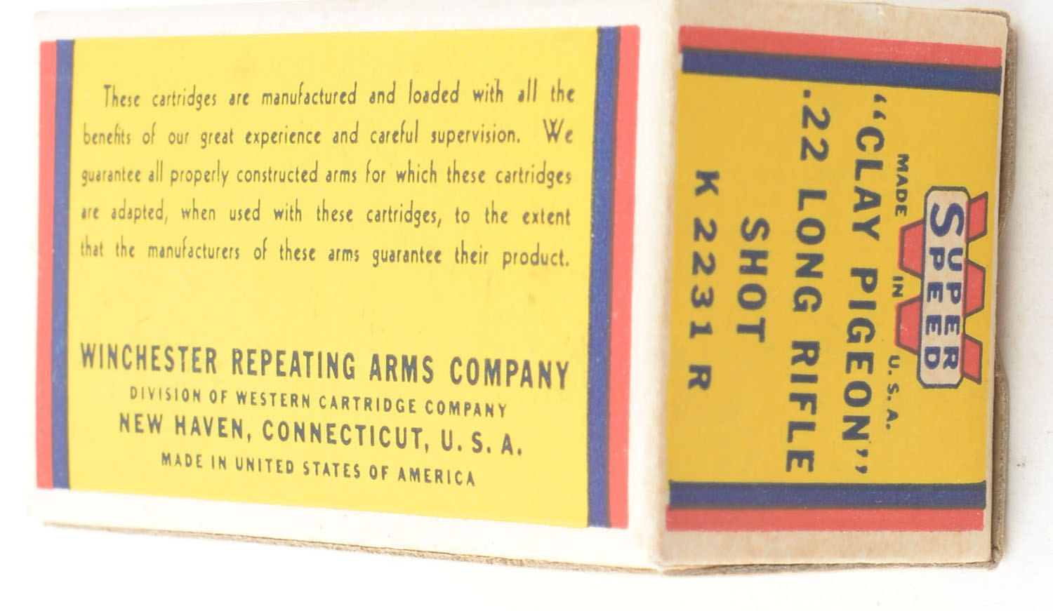 Winchester, Super Speed ''Clay Pigeon'', .22 Long Rifle Shot, RHWeb: WRA-15 LR-5a, Full, 1pc. Yellow blue & red box, box is near mint with minty color, only very minor edge wear, corners are sharp, end flaps are solid, end flaps are solid, ammo is excellent. Grade: Excellent ++ - Value: 60 to 90