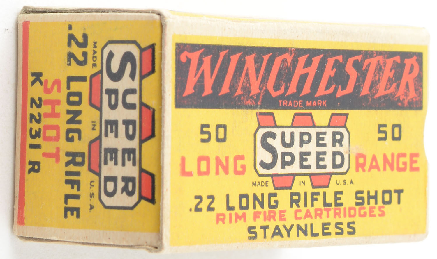 Winchester, Super Speed, .22 Long Rifle Shot, Staynless, RHWeb: WRA-15 LR-4, Full, 1pc. Yellow red & black box, box is solid with excellent color, very minor edge wear, corners are mostly sharp, edges are crisp, end flaps are solid, ammo is excellent. Grade: Excellent + - Value: 80 to 120