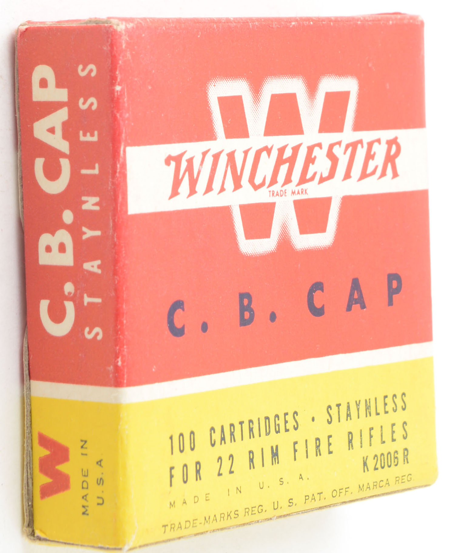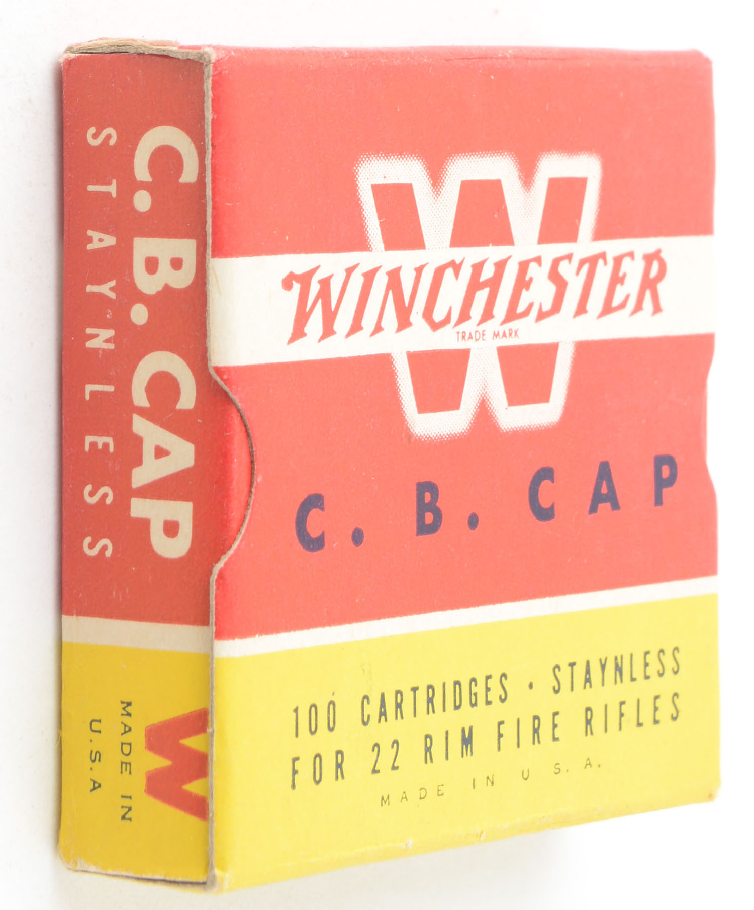 Winchester, Staynless, C.B. Caps, Staynless, RHWeb: WRA-17 CB-1a, Full, 1pc. Red yellow & white box, box is solid with excellent color, very minor edge & corner wear, end flaps are solid, ammo is excellent. Grade: Excellent + - Value: 50 to 75