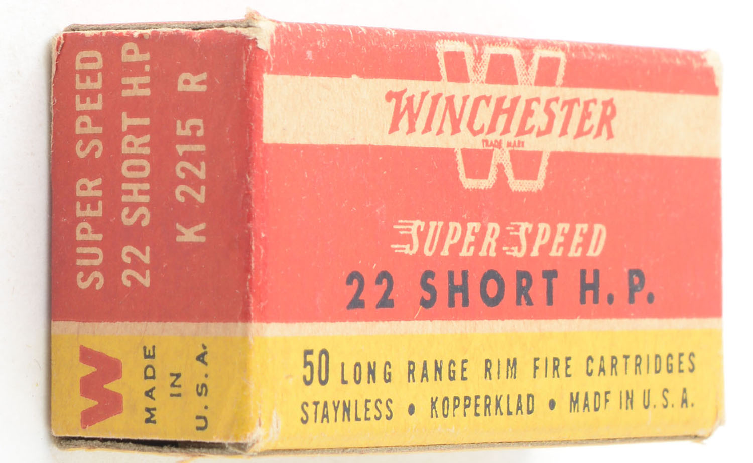 Winchester, Super Speed, .22 Short Hollow Point, RHWeb: WRA-17 S-3a, Full, 1pc. Red yellow & white box, box is solid with very good color, some age soiling, minor edge & corner wear, end flaps are solid, ammo is excellent. Grade: Very Good ++ - Value: 12 to 18