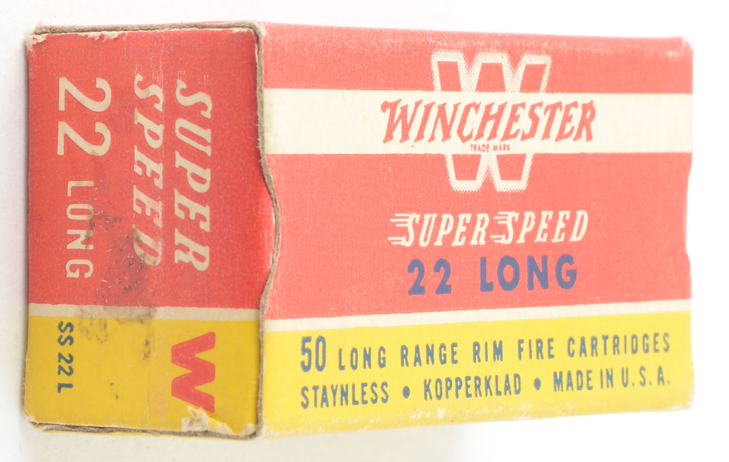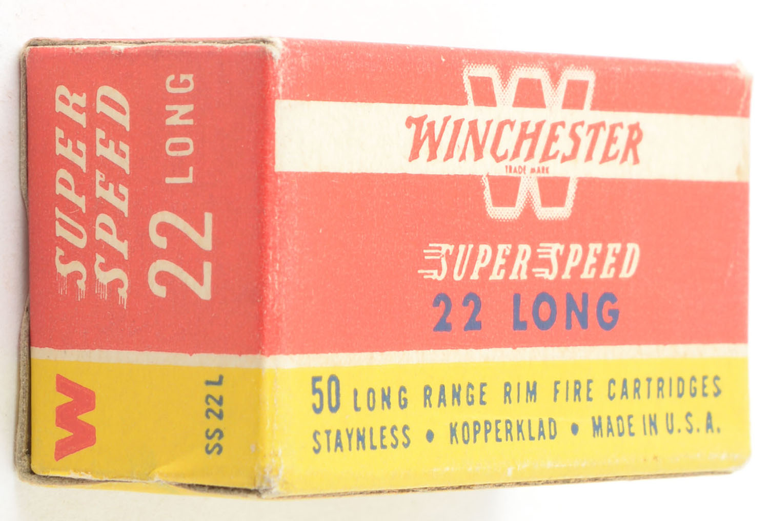 Winchester, Super Speed, .22 Long, RHWeb: WRA-17 L-1c, Full, 1pc. Red yellow & white box, box is solid with excellent color, minor edge & corner wear, end flaps are solid, ammo is excellent to minty. Grade: Excellent - Value: 12 to 18