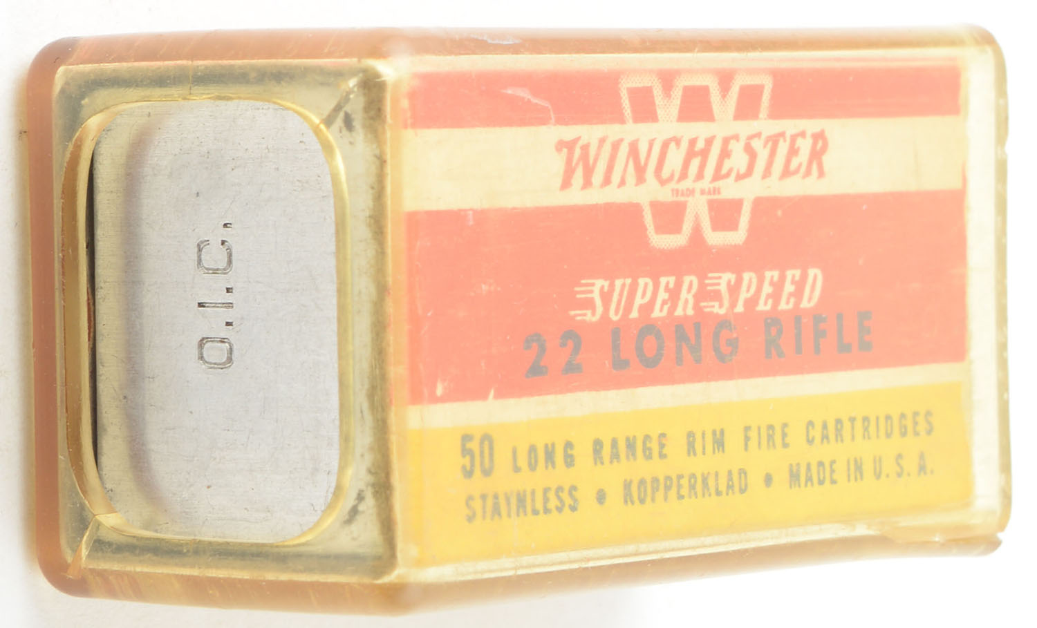Winchester, Super Speed, .22 Long Rifle, RHWeb: WRA-17 LR-1d (nickel cases), Full, 1pc. Red yellow & white box inside an O.I.C. Plastic case from the 1940's with a sliding aluminum tray, missing both end flaps, excellent color, very minor age soiling, O.I.C. case is solid with some yellowing, ammo is excellent. Grade: Excellent - Value: 40 to 60