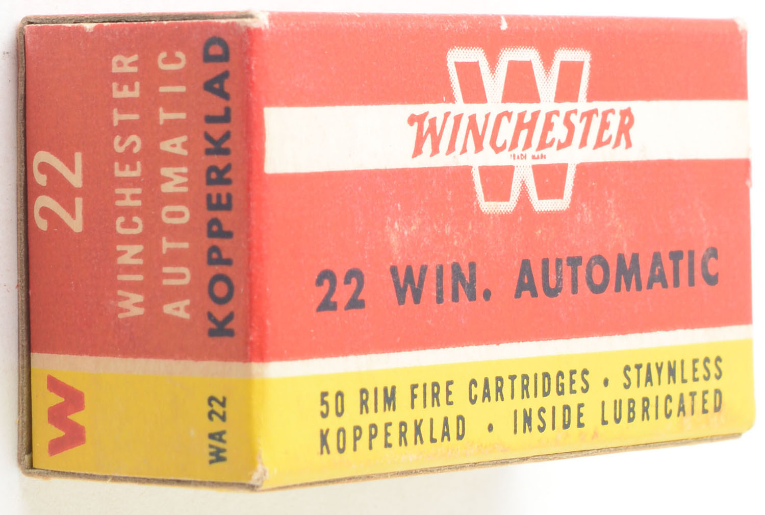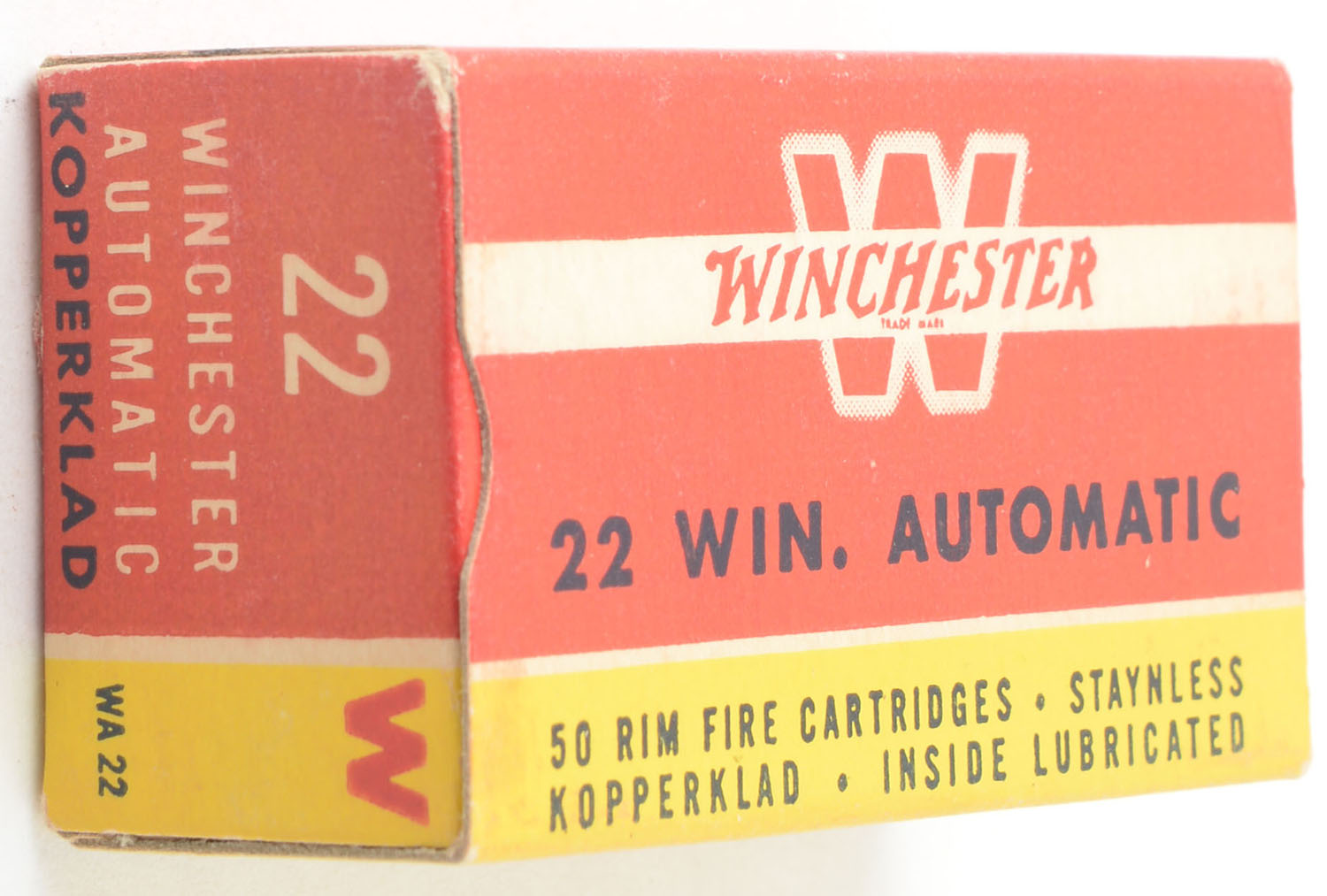 Winchester, .22 Winchester Automatic, Staynless Kopperklad, RHWeb: WRA-17 WA-1b, Full, 1pc. Red yellow & white box, box is solid with excellent color, very minor age soiling & corner wear, edges are crisp, end flaps are solid, ammo is excellent. Grade: Excellent + - Value: 40 to 60